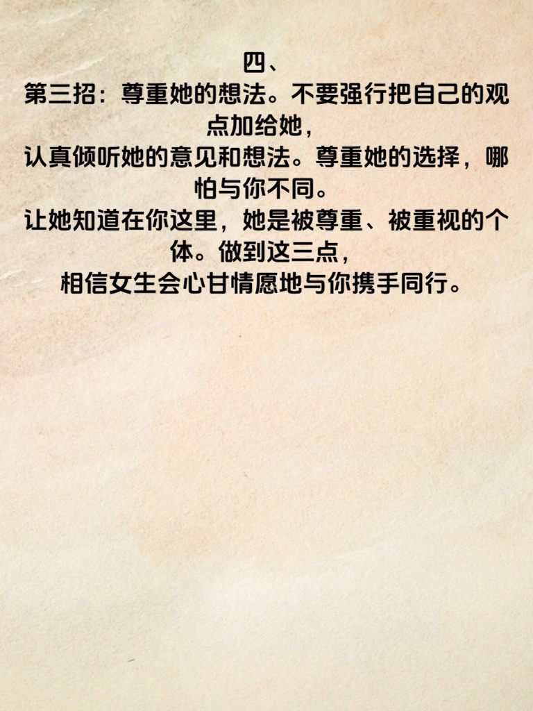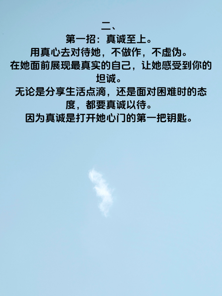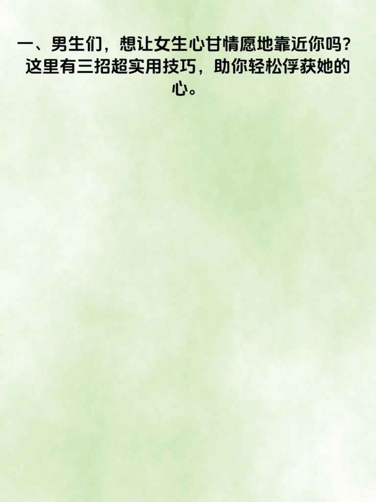 一、男生们,想让女生心甘情愿地靠近你吗?这里有三招超实用技巧,助你轻松俘获她的心。 二、第一招:真诚至上。用真心去对待她,不做作,不虚伪。在她面前展现最真实的自己,让她感受到你的坦诚。无论是分享生活点滴,还是面对困难时的态度,都要真诚以待。因为真诚是打开她心门的第一把钥匙。 三、第二招:贴心关怀。留意她生活中的小细节,在她疲惫时递上一杯温暖的咖啡,在她生病时悉心照顾。记住她的喜好,在特殊日子送上惊喜。贴心的关怀会让她心里充满温暖,渐渐对你产生依赖。 四、第三招:尊重她的想法。不要强行把自己的观点加给她,认真倾听她的意见和想法。尊重她的选择,哪怕与你不同。让她知道在你这里,她是被尊重、被重视的个体。做到这三点,相信女生会心甘情愿地与你携手同行。