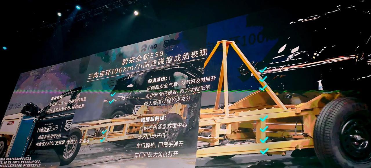 蔚来用一台全新的ES8以100km/h的时速三向连环碰撞,也就是同一台车分别三个