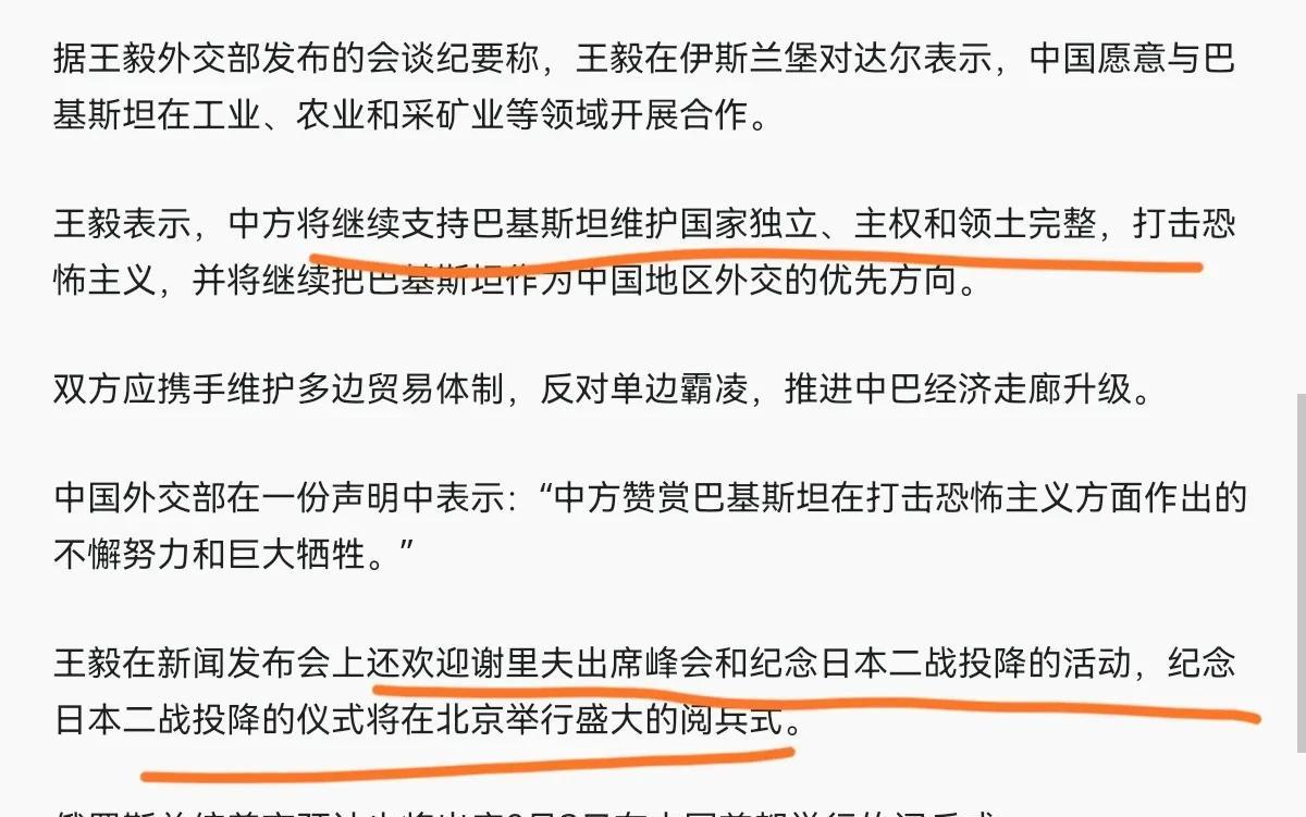 莫迪绝大概率不会出席我们的阅兵式了!在访巴之行中,中国作出了几个重大宣布,印度估计心里面又犯嘀咕了。8月22日,根据外媒报道,在访巴之行中,我们的王毅外长郑重表示,其一,中方将继续支持巴基斯坦维护国家独立、主权和领土完整,打击恐怖主义,并将继续把巴基斯坦作为中国地区外交的优先方向。 其二,王毅外长表示,中国将与巴基斯坦在工业、农业和采矿业等领域开展合作。其三,王毅外长表示,欢迎巴基斯坦总理谢里夫出席峰会和纪念日本二战投降的活动,参加在北京举行盛大的阅兵式。很显然,中巴加强经贸合作,这在预料之中。但我们当面邀请巴基斯坦总理出席阅兵式,并继续支持巴基斯坦维护国家独立、主权和领土完整,打击恐怖主义,这样的表态印度必然会有想法。 从我们的角度而言,尽管我们并非针对印度,但是鉴于印巴5.7空战之后,印巴关系急剧恶化,中巴持续保持热络的关系,印度肯定会不舒服。现在我们对巴基斯坦总理发出出席阅兵式的邀请,中巴作为铁杆朋友的关系,巴基斯坦总理几乎可以确定出席我们的阅兵式,而在这样的情况下,印度总理莫迪很显然不希望以这样的方式与巴方领导人同框。何况,毋庸讳言的事实是,中印关系也才出现回转。因此,莫迪绝大概率不会出席我们的阅兵式了!