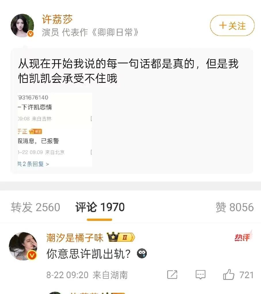第一个敢正面和于正硬刚的女明星出现了! 许荔莎说自己和许凯恋爱过,于正火速辟谣说是假的,已经报警了,结果许荔莎转头就曝出大瓜,称自己现在的确不是许凯的女朋友,因为2022年的时候,许凯出轨和赵晴开房,所以她和许凯分手了。 同时许荔莎还回怼于正:“从现在开始我说的每一句话都是真的,但是我怕凯凯会受不住哦。” 于正撕了那么多娱乐圈的明星,这还是第一次有明星敢正面和于正硬刚的,许荔莎这是真勇啊。 不过从这点也能看出,许荔莎大概率真的和许凯谈过,且手里握着许凯大量黑料,不然她不敢赌上自己的事业和于正硬刚。 且于正的辟谣在经历吴谨言事件的骗你就骗你后,也没多少人相信他的话了,现在就看许荔莎能拿出什么样的瓜来了。