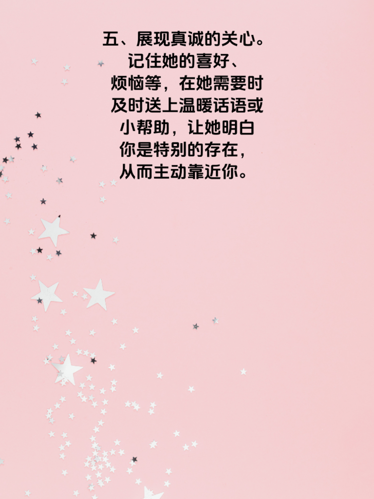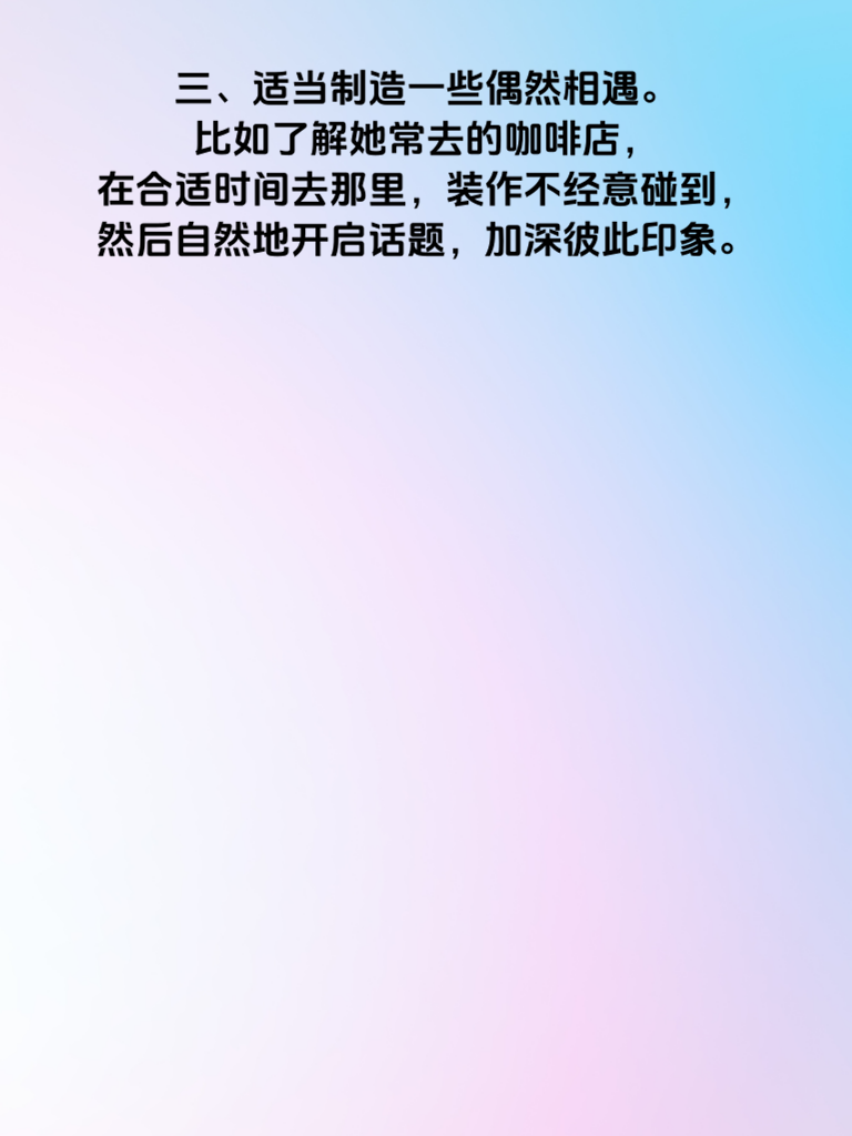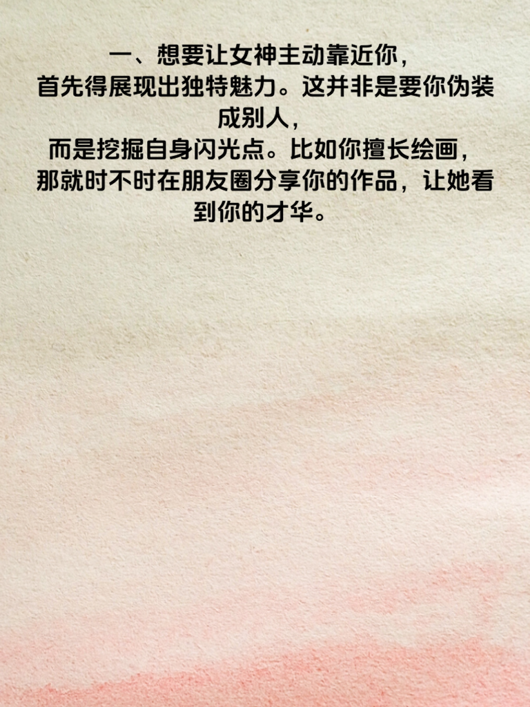 一、想要让女神主动靠近你,首先得展现出独特魅力。这并非是要你伪装成别人,而是挖掘自身闪光点。比如你擅长绘画,那就时不时在朋友圈分享你的作品,让她看到你的才华。 二、保持自信很关键。自信的气场能吸引他人,和女神交流时,眼神坚定,声音平稳,不卑不亢地表达自己观点,让她感受到你的沉稳可靠。 三、适当制造一些偶然相遇。比如了解她常去的咖啡店,在合适时间去那里,装作不经意碰到,然后自然地开启话题,加深彼此印象。 四、学会倾听她的想法。当她说话时,专注倾听,给予回应,让她觉得你重视她。适时分享自己的见解,但别强行主导话题。 五、展现真诚的关心。记住她的喜好、烦恼等,在她需要时及时送上温暖话语或小帮助,让她明白你是特别的存在,从而主动靠近你。