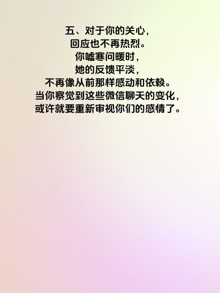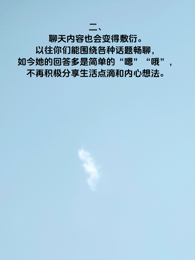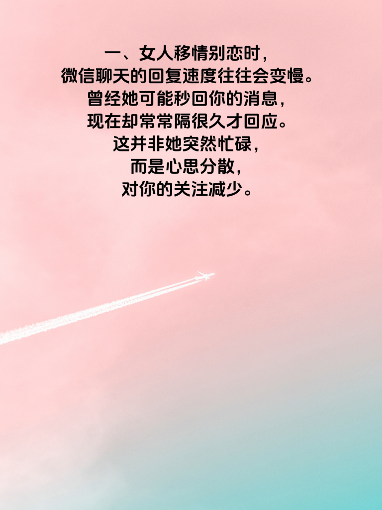 一、女人移情别恋时,微信聊天的回复速度往往会变慢。曾经她可能秒回你的消息,现在却常常隔很久才回应。这并非她突然忙碌,而是心思分散,对你的关注减少。 二、聊天内容也会变得敷衍。以往你们能围绕各种话题畅聊,如今她的回答多是简单的“嗯”“哦”,不再积极分享生活点滴和内心想法。 三、她开始回避一些亲密话题。过去你们或许会轻松调侃暧昧,现在一提及相关,她就巧妙转移话题,态度变得冷淡。 四、主动发起聊天的频率大幅降低。以前她可能经常找你聊天,现在却很少主动开启对话,仿佛失去了那份热情。 五、对于你的关心,回应也不再热烈。你嘘寒问暖时,她的反馈平淡,不再像从前那样感动和依赖。当你察觉到这些微信聊天的变化,或许就要重新审视你们的感情了。