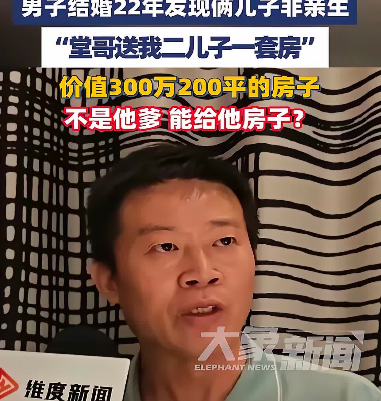 终于知道! 为什么大儿子要出来争房子, 二儿子从来不露面了,因为二儿子不争这两套房子是因为他有一套房子,那套房子是男子的堂哥在二儿子12岁的时候送的,价值300万。 大儿子争这两套房子还另有原因,那就是他想要保住这两套房子,想要这两套房子的原因他也知道自己可能不是亲生的,但他不敢做亲子鉴定,生怕把真正的亲生儿子鉴定出来,那他这两套房子就没戏了。 其实这个男孩还是太年轻,他应该在事情一发生的时候就和爸爸面对面的交谈。表明态度:如果不是亲生,那么他的价值观告诉他,他的妈妈就是个恶毒的妇人。他会和他爸爸维持父子关系,养老送终,只认这个养自己的父亲。我相信他爸爸一般会接受。 但是你看他,感觉像是东窗事发一样,第一时间去做伤害他爸的事情。不问事情的起源,不问他妈得对错,只在那一味的狡辩。 哎,还是太年轻了。但是即使年轻也不该如此,终归到底还是心坏像根。