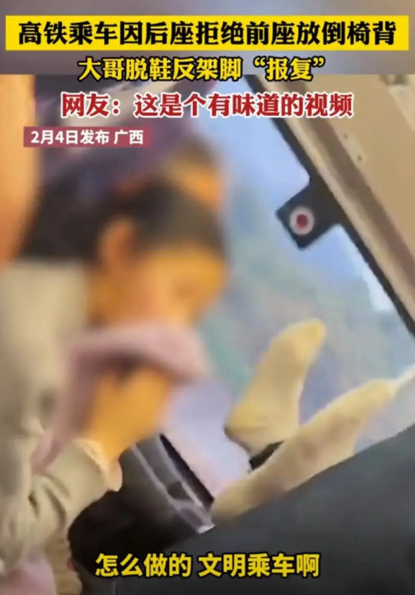 报复心太强了!广西,一男子乘高铁,想放倒座椅靠背休息,不料后面两女乘客不乐意,不让他放倒,还一边一只脚放到他座位旁,男子心生不满,竟直接脱了鞋,反架脚报复,因脚味儿太大,后面女乘客无奈用围巾捂住口鼻!