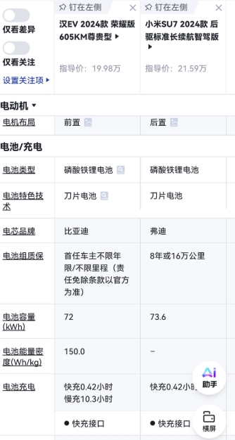 汉ev续航与小米su7续航 汉比小米少了一度电,重量重了40斤,同样厂家的电池,为小米敢标700,汉却是标605。