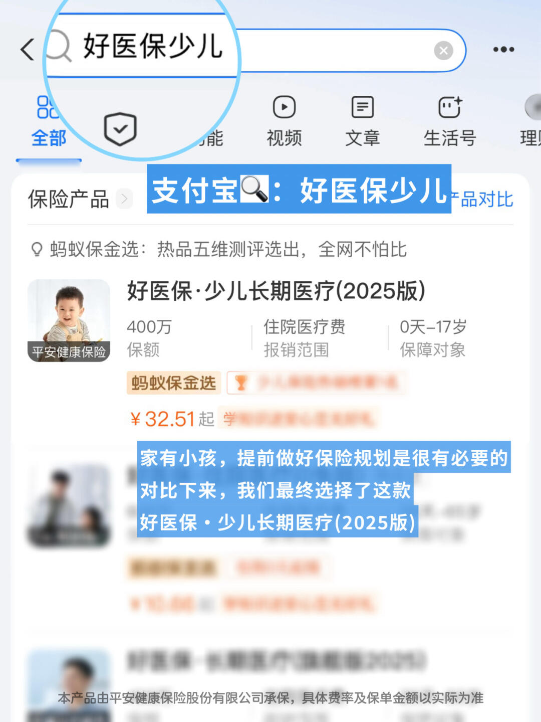 支付宝搜【好医保少儿】,每个月只要几十块(费率随年龄不同而变化),就能享受每年最高赔付限额400万的保障,有这份保障心里踏实多了