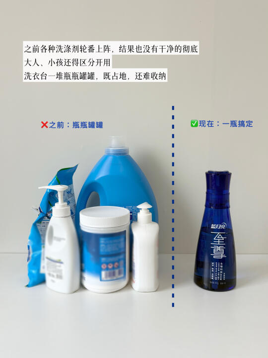 到头来洗衣台一堆瓶瓶罐罐,看着都难受……