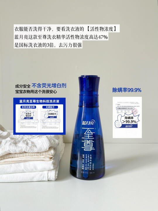 蓝月亮这款至尊洗衣精华活性物浓度高达47%,是国标洗衣液的3倍,去污力强到没朋友!