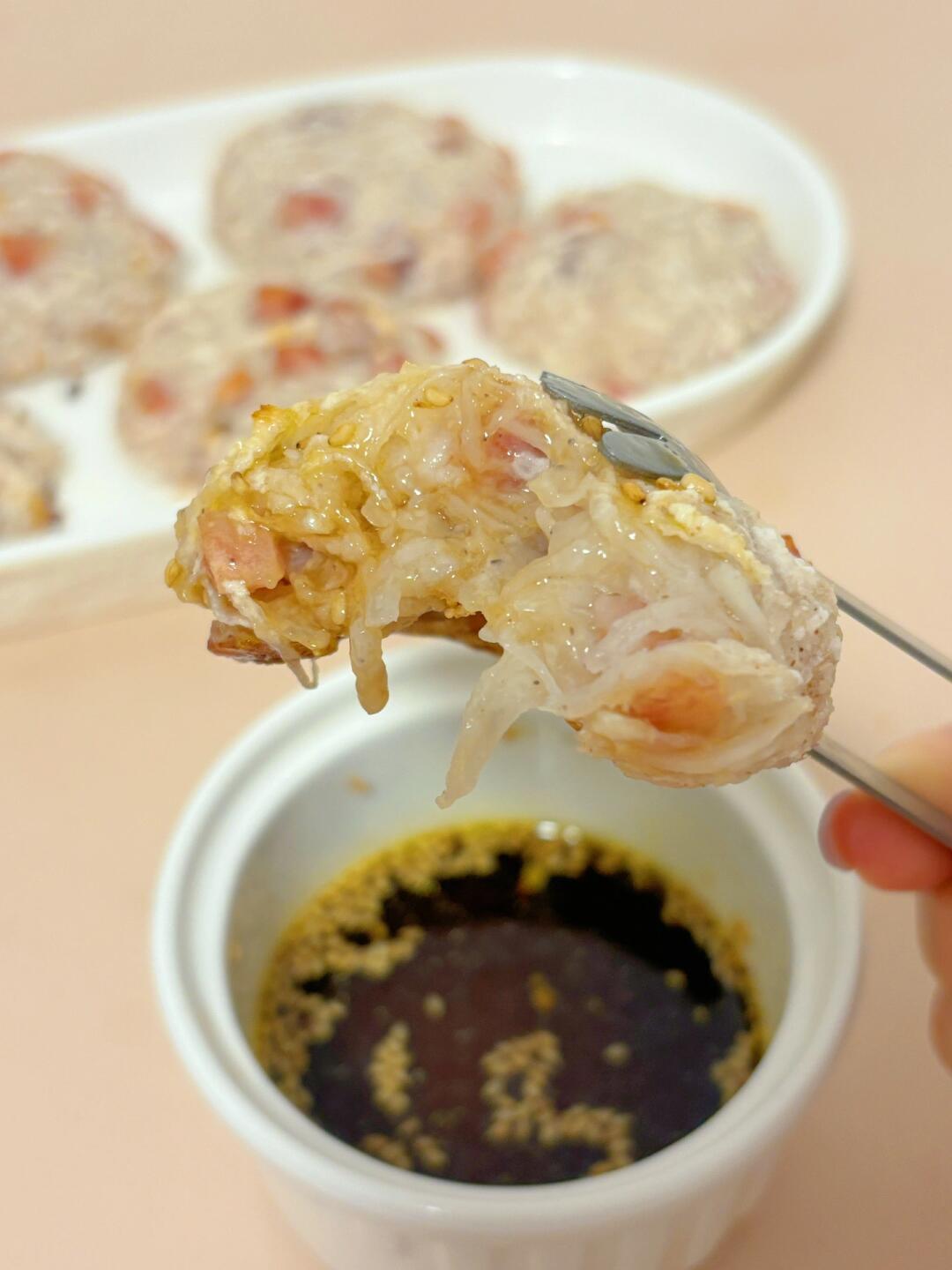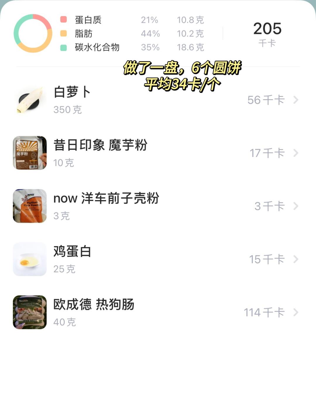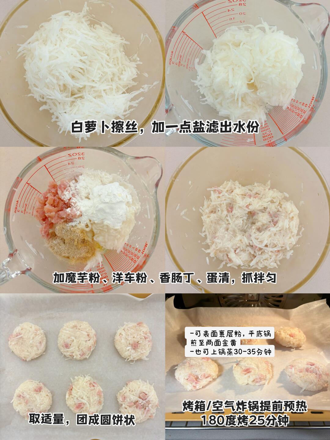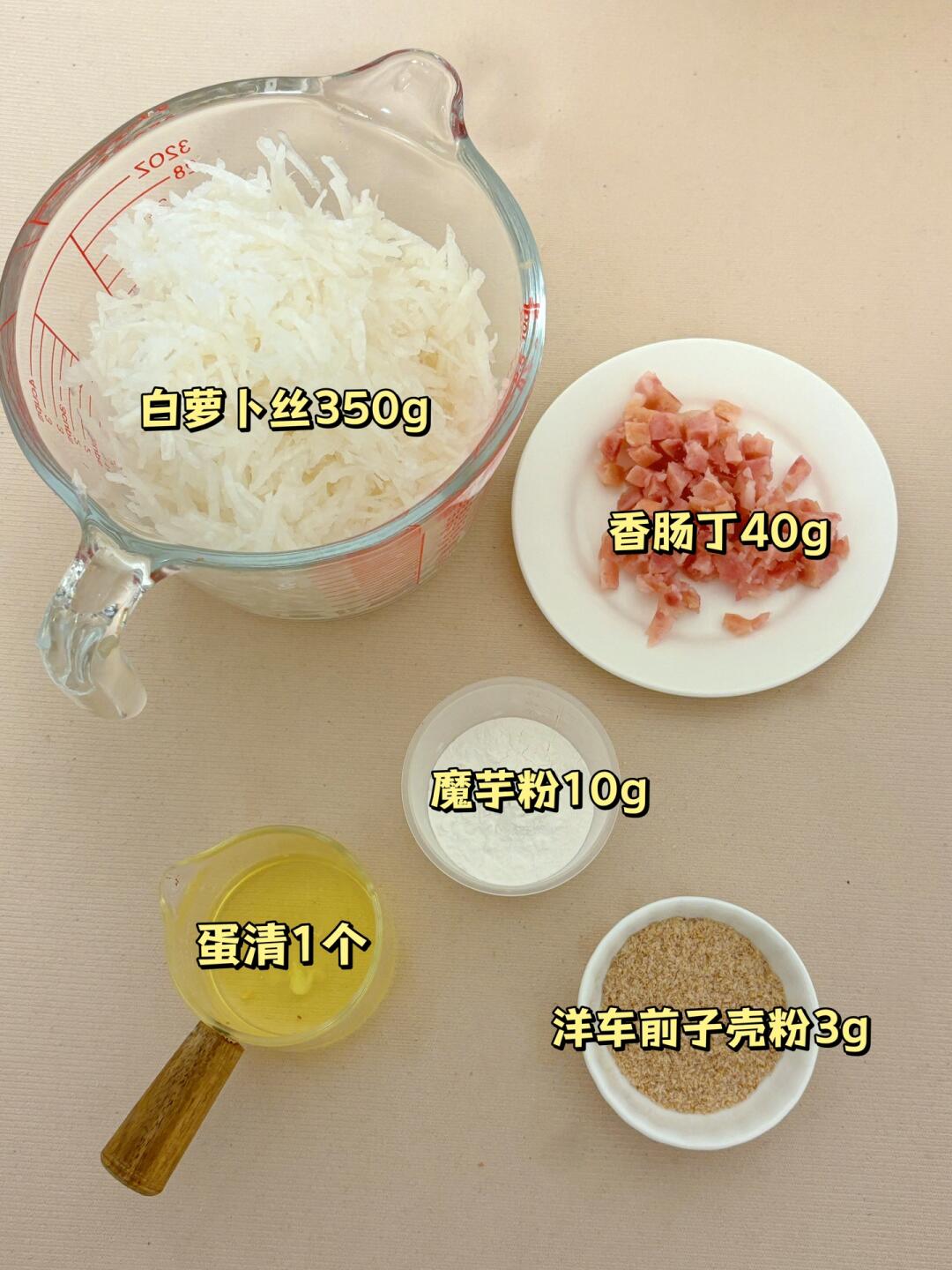 👩🍳都说冬吃萝卜夏吃姜,不知道咋吃的可以试试这个~无油无面粉,糯唧唧低卡萝卜糕‼️ 💕34卡/个|煎、蒸、烤都🉑 🌈老人小孩、减脂、健身都可食~ . 🍃食材(205卡-6个👉附热量表): 白萝卜1根(约350g) 魔芋粉10g 洋车前子壳粉3g(🉑不放) 蛋清1个 香肠40g 🌈肉类可按自己喜好,广式是腊肠,但我没有,换成了热狗肠🙉 . 食材简单,美味不简单‼️ 做减脂餐,低卡饱腹,巨nice~入口有点糯叽叽的~ ️🌈姐妹们都要多吃不胖!