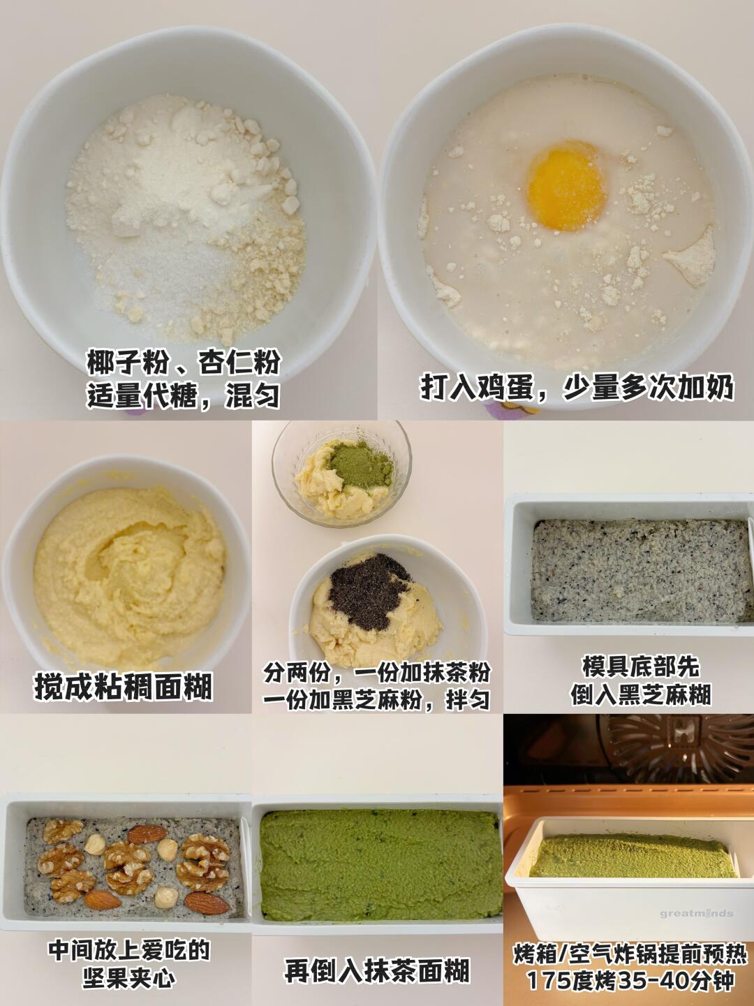 👩🍳网红手作磅蛋糕,家庭复刻简易版,无糖油无面粉,搅搅ok,食材已优化至zui简,🐴住~ 💕84卡/片 🌈减脂、健身、生酮、抹茶控、黑芝麻控、磅蛋糕脑袋都去做~ . 🍃食材(505卡-300g/条👉附热量表): 椰子面粉40g 杏仁粉20g(原版为蛋白粉) 鸡蛋1个 黑芝麻粉10g 抹茶粉3g 奶170ml 坚果适量 🌈代糖的量自己掌握✋~ . 食材简单,美味不简单‼️ 做早餐或下午茶,切片配咖啡或者茶,就很nice!口感匝实,很抗饿! 🌈姐妹们都要多吃不胖~