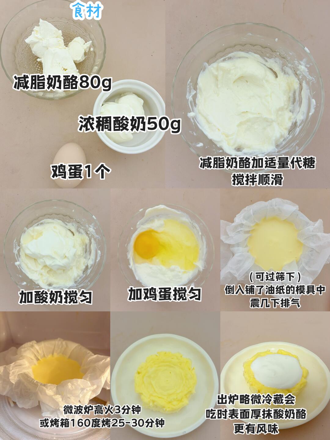 👩🍳嘴馋想吃甜品🍮,3分钟就能做,低碳水芝士蛋糕~无糖油无面粉,微波炉就ok,1人食配比速度🐴住 💕223卡/份|烤箱/微波炉都ok 🌈减脂、健身、生酮、芝士蛋糕脑袋都去做 . 🍃食材(223卡-4寸👉附热量表): 减脂奶酪80g 浓稠酸奶50g 鸡蛋1个 🌈代糖的量自己✋~想要口感更匝实细腻,加一点玉米淀粉/魔芋粉/低粉等 . 食材简单,美味不简单‼️ 做早餐或下午茶,配咖啡或者茶,就很nice! 🌈姐妹们都要多吃不胖~