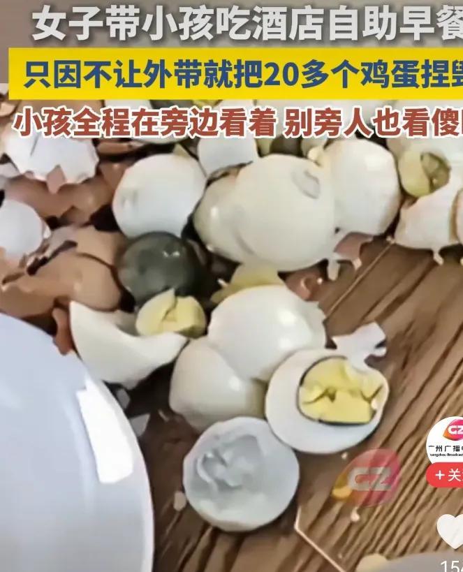 这个叫曾智玲的女人是出大名了,一下子名噪全网! 就因为早餐时她拿了20个鸡蛋要带走,被酒店工作人员阻止后,她进行了疯狂的报复! 人家把鸡蛋全都剥皮了,然后把蛋清蛋黄碾碎了,扔在了桌子上后领着孩子扬长而去! 这个女人素质真的实在是太差了,道德低到尘埃里了,自己的孩子还在现场呢! 她是谁家的女儿?又是谁家的老婆?这种恶行来自于遗传,她难道不知道勿以善小而不为,勿以恶小而为之的道理吗?