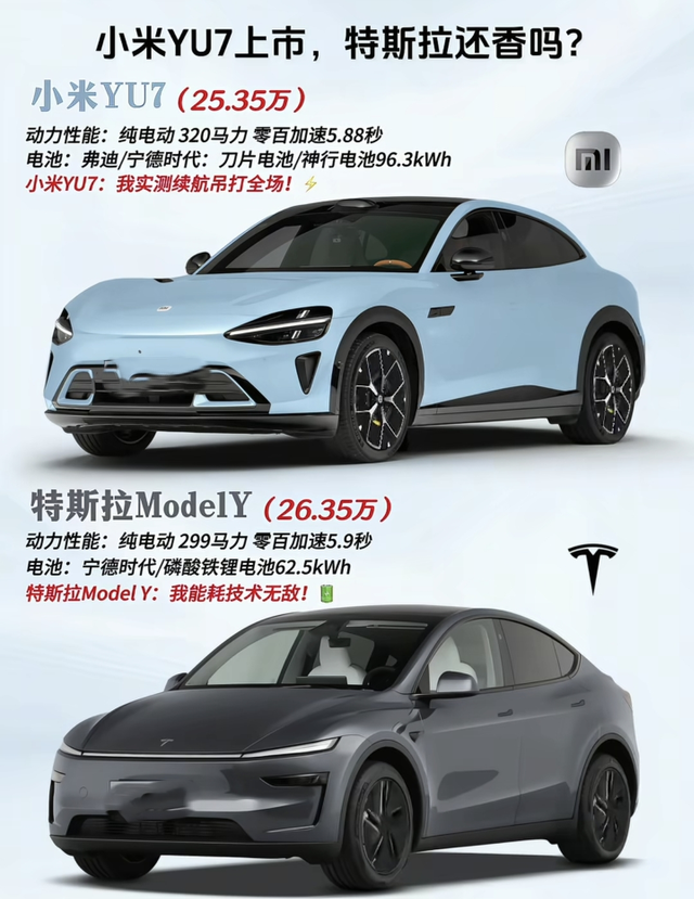 如果预算在25万左右,选择小米YU7还是特斯拉Model Y可以参考以下几个方面: 价格 - 小米YU7:2025款超长续航后驱版价格为25.35万。 - 特斯拉Model Y:2025款后轮驱动版价格26.35万,部分地区有优惠,优惠后与YU7价格接近。 性能与续航 - 小米YU7:后驱版320马力,0-100km/h约5.3秒;CLTC续航约835km(WLTP约685km)。800V高压平台,15分钟可充620km。 - 特斯拉Model Y:后驱版约300马力,0-100km/h约6.9秒;CLTC续航593km。充电10%-80%需27分钟。 配置与科技 - 小米YU7:全系标配激光雷达、NVIDIA Thor芯片,有56英寸HUD、HyperOS系统,可控制小米生态家电。配备主动空气悬架、软关闭门等。 - 特斯拉Model Y:15.4英寸中控屏,Autopilot标配,可选FSD。2025款新增10%续航、六座选项及优化底盘舒适性。 品牌与售后 - 小米:作为新晋车企,品牌认可度在上升,售后网络覆盖39城211家门店,需时间完善。 - 特斯拉:全球电动车领导者,售后网络覆盖更广,服务经验丰富。 如果预算严格控制在25万左右,追求高续航、豪华配置和极致性价比,喜欢科技感和智能生态,愿意接受新品牌和较长交付周期,小米YU7标准版是不错的选择。如果看重品牌可靠性、成熟的智能驾驶生态、快速交付以及全球售后网络,对空间实用性和保值率有要求,特斯拉Model Y可能更适合。