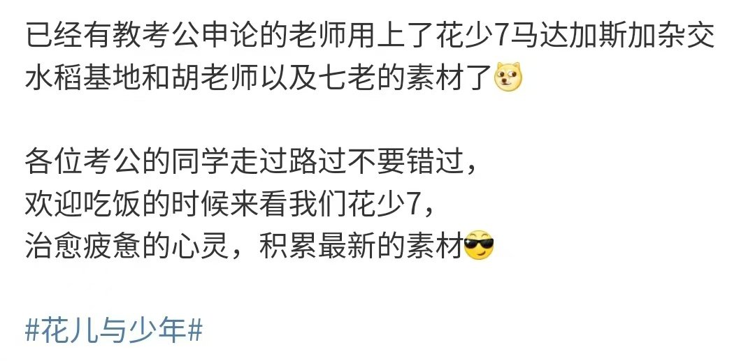 花少火到考公圈了 花儿与少年 考公人集合!《花少7》里的胡月舫老师太宝藏了,马达加斯加推广杂交水稻的故事,申论老师直接划重点,追综艺还能攒素材!