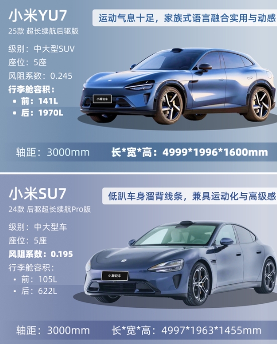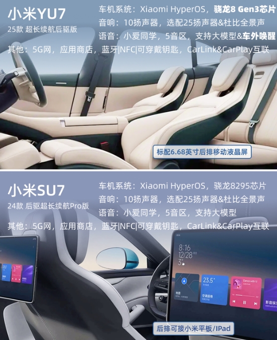 小米YU7对决小米SU7怎么选 外观空间上:YU7延续SU7的家族式运动基因,配备“水滴大灯”及镂空式空气动力学设计,还带有141L前备厢和后备厢678L超大储物空间,颜值不输SU7却又更实用! 续航操控上:YU7全系800V碳化硅高压平台,高配版支持5.2C超充,15分钟补能620km,另外两个配置也支持3C快充;三种版本均搭载V6sPlus电机,充电速度、动力系统相较SU7都有提升! 内饰座舱上:除了16.1寸3K中控大屏外,还搭载小米天际屏全景显示技术。高配版还带了防晒又隔热的智能调光天幕。零重力座椅全系限时免费,冰箱全系可选配! 驾驶辅助上:小米YU7这次不仅全系搭载激光雷达和Thor芯片,还升级了全新1000万Clips版本的端到端辅助驾驶,YU7全系出厂即搭载!