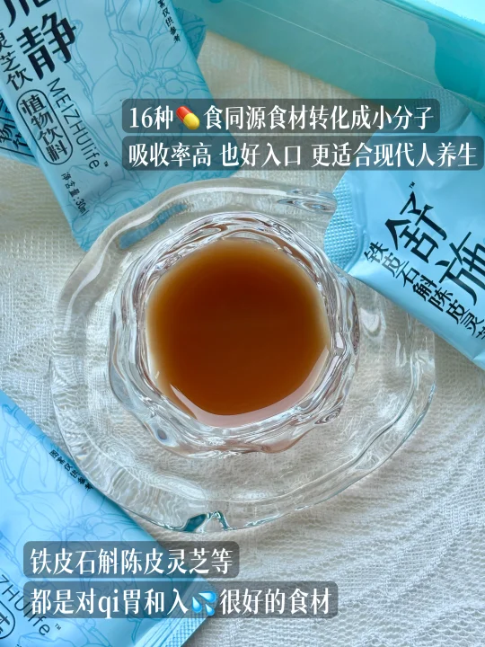 它用了现代化多菌共生发酵技术,把铁皮石斛、陈皮、灵芝等16种药食同源的好食材,通过发酵把大分子变成小分子,这样身体吸收起来没负担,吃进去的营养能更好地被“利用”起来。