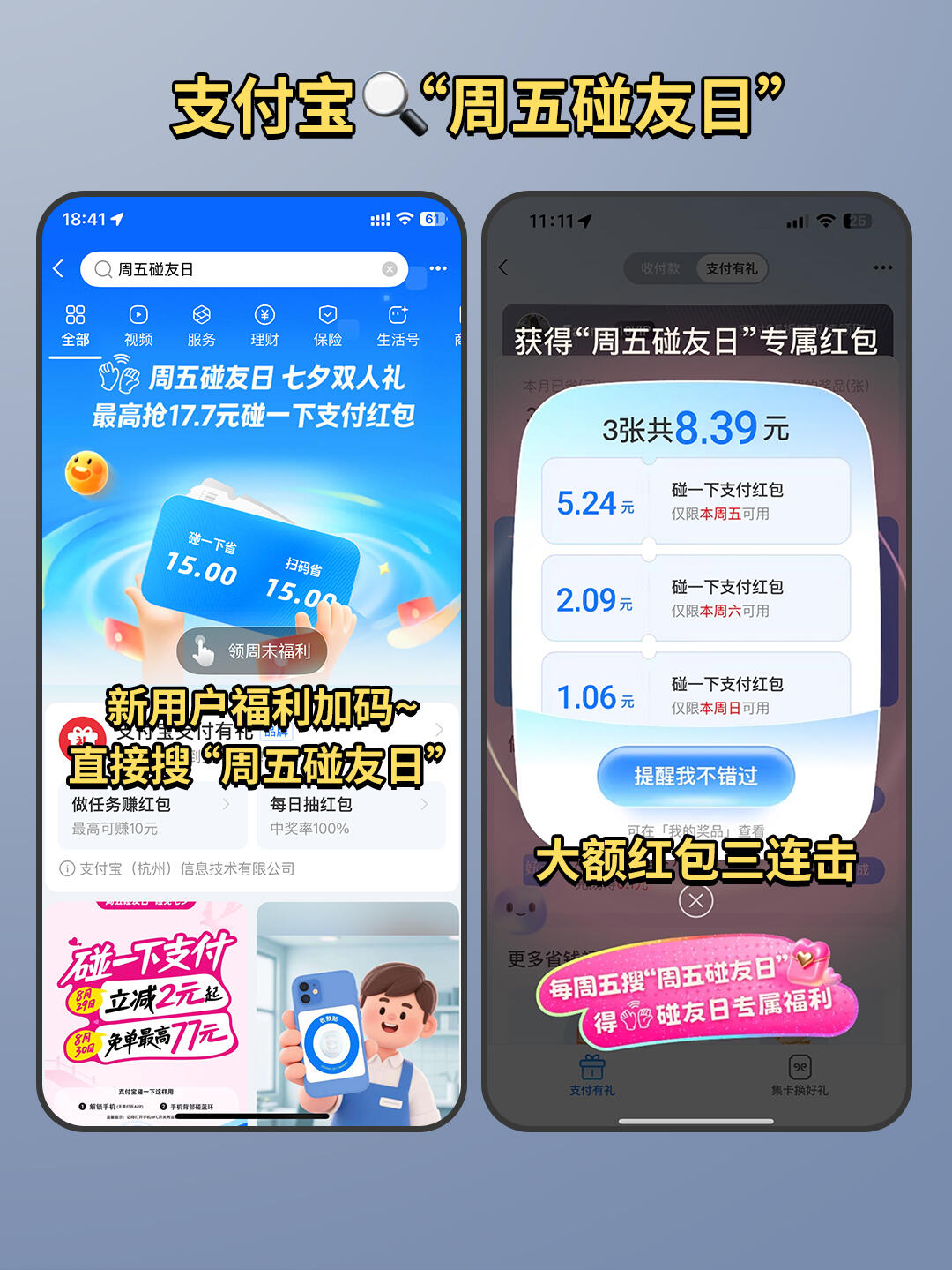 支付宝🔍“周五碰友日” 就能进入活动页面,新用户更别错过这份专属福利!不用等特定节日,每周五都能靠这波红包收获小开心,这羊毛不薅真的亏!