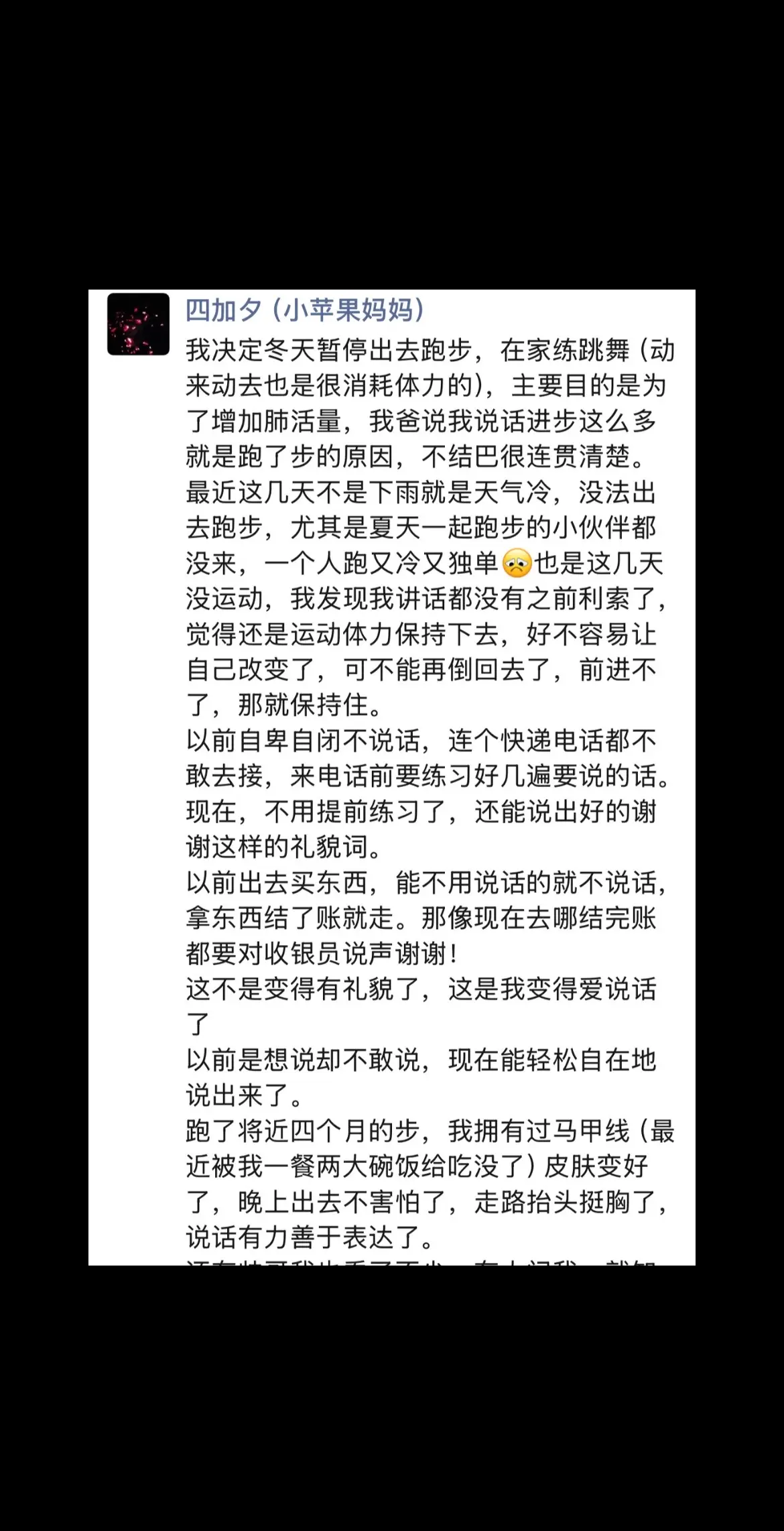 二十二岁能坚持下来 二十七岁也能坚持下去。因为跑步真的改变我很多 没结婚没生娃前的那几年 我享受跑步带来的快乐,跑完步成就感,每天的夜跑打卡成了我的动力 我知道前期很难熬,脚会很痛,跑步不只是为了减肥 所以我想证明一下下我真的坚持过 以后我也能坚持下去
