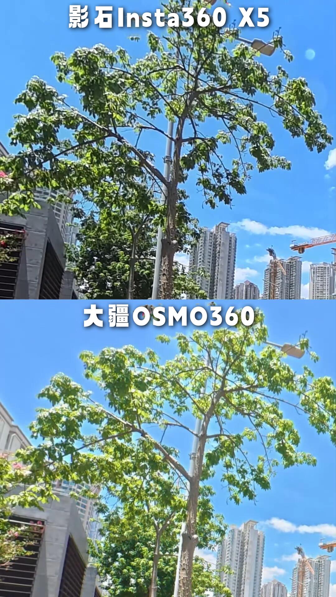 经过网上多篇文章的总结,可以说大疆跟影石各有千秋。大疆硬件更强一些,影石软件跟AI算法也遥遥领先。今天就从一些刁钻的细节来看看,两家对于画质细节处理这一块哪家强呢? 以上素材均在8K30帧参数下录制。 曝光控制:图一可以看到大疆这边曝光控制邵逊色于影石,放大之后,可以看到图二,影石这边细节更丰富一些。再来看看图三,两家的画质是都不错的,但是亮部细节大疆似乎出现了弊端,树叶泛光明显,不知道后期能不能调回来。 至于色彩差异为啥这么明显,其实是由于两家对色彩的调教各不相同,这个就要看用户个人喜好了。影石这边可能更加鲜艳一些,可以原图直出,适合新手小白。而大疆这边后期空间较大,适合老手。 有对比才有进步!希望两家都能在全景领域互相卷起来,让用户们在全景相机领域得到更好的体验! 对比完上面三组画面,你们更喜欢哪家的表现呢?