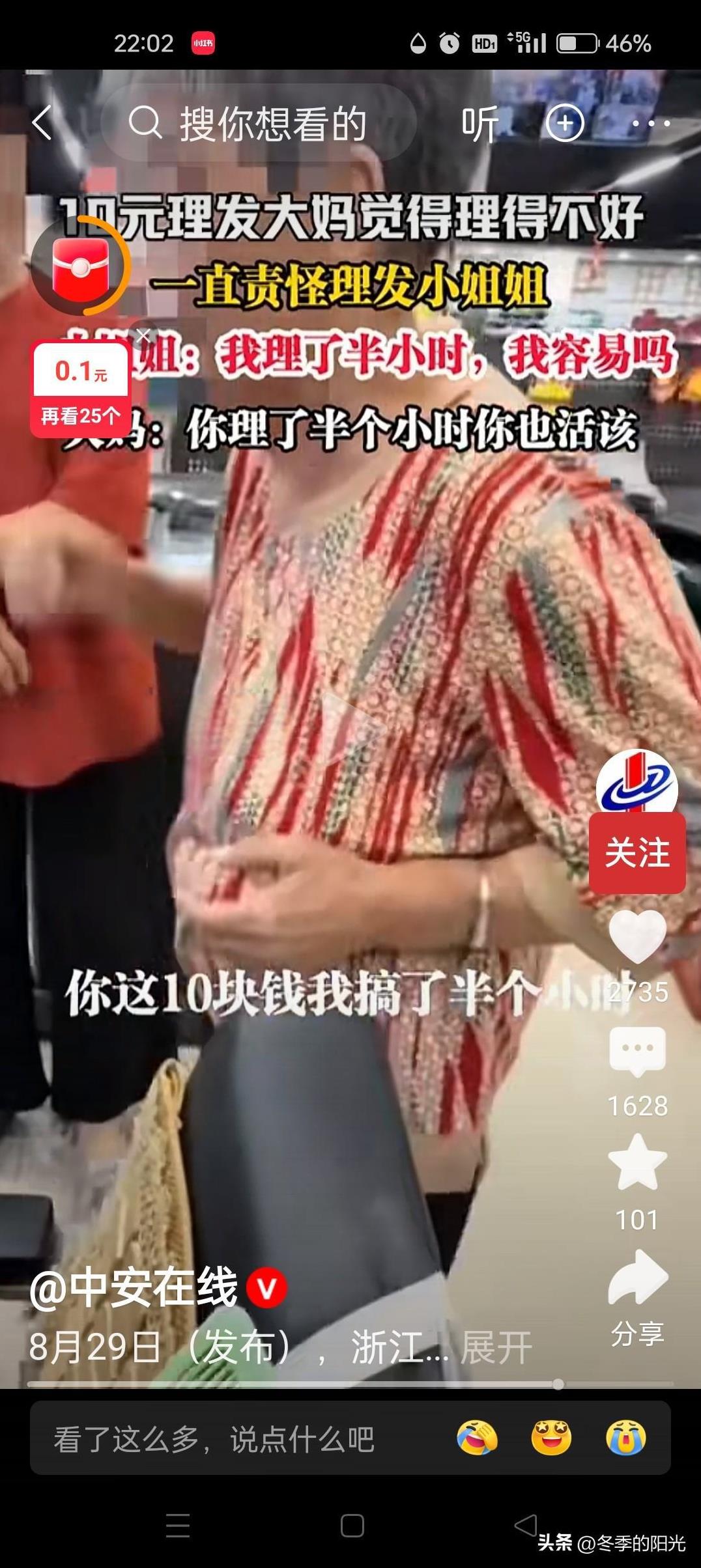 10块钱理个发搞了半个小时,老太太非常不满意,最好丢了一句你活该。 我想如果理发
