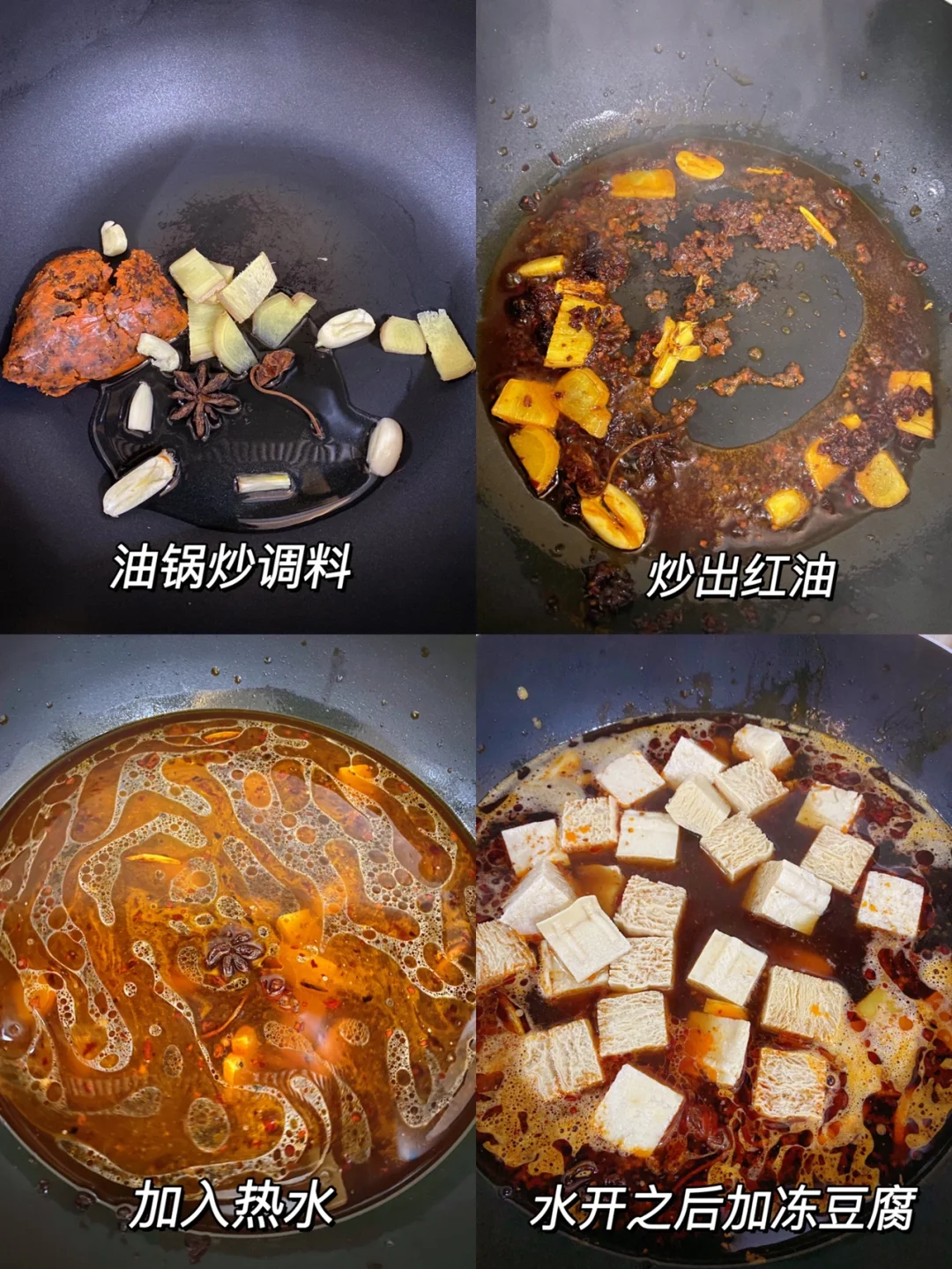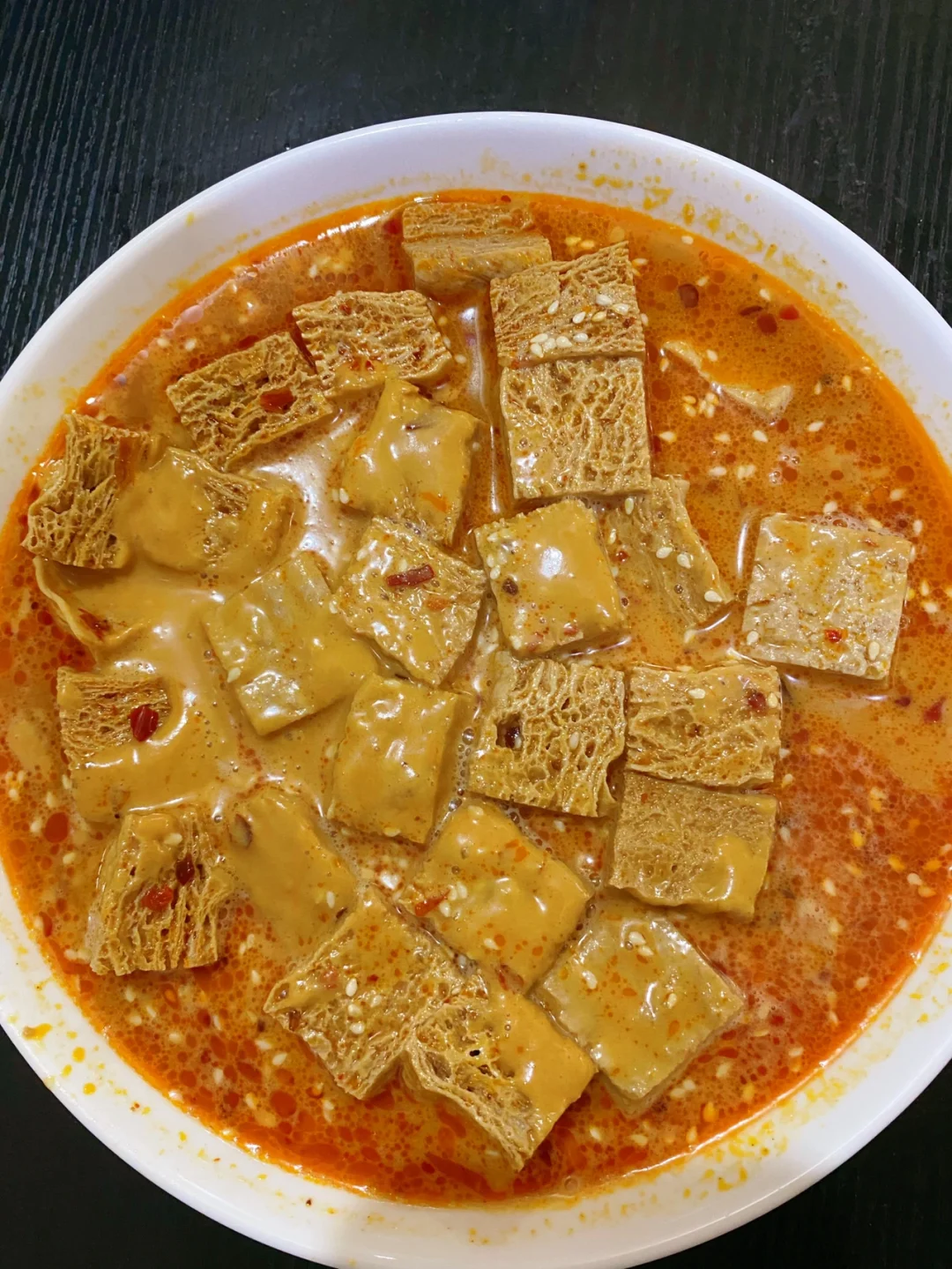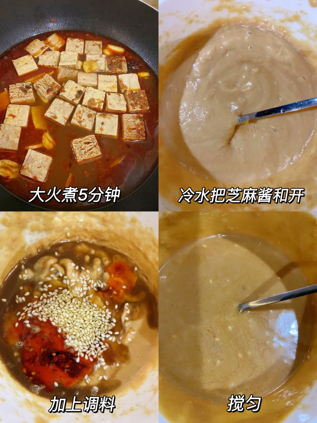 跟外面的小吃摊一样!! 太好吃啦!! 1⃣️油锅炒火锅底料、姜片、蒜、八角,炒出红油之后加入热水,水开之后加入冻豆腐大火煮5分钟 2⃣️芝麻酱用水和开,加入盐、白糖、生抽、陈醋、辣椒油、花椒油、白芝麻搅匀,倒在煮好的冻豆腐上 完成✅ 哇!! 满满的都是汤汁 裹上芝麻酱好浓郁!!