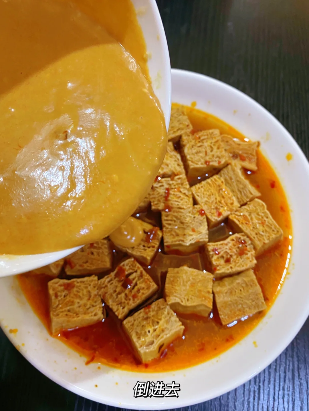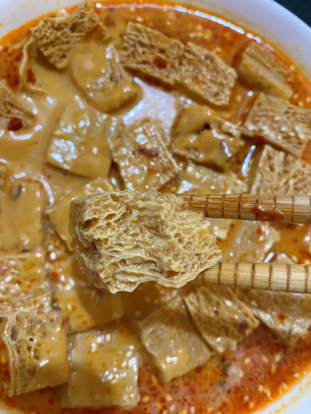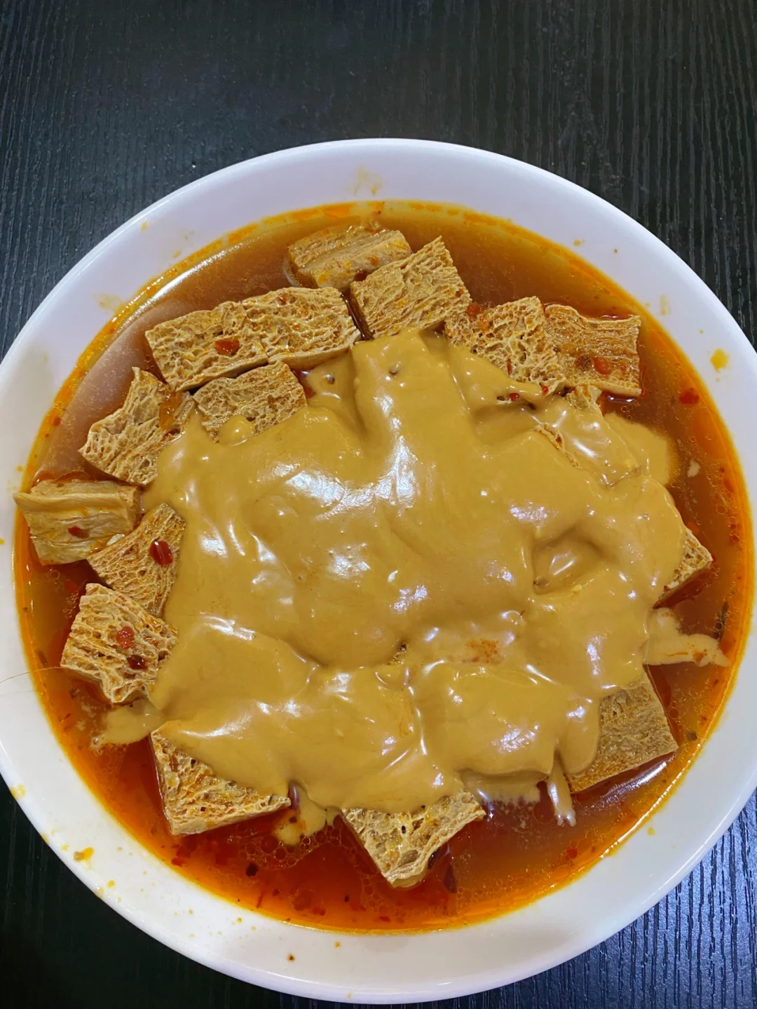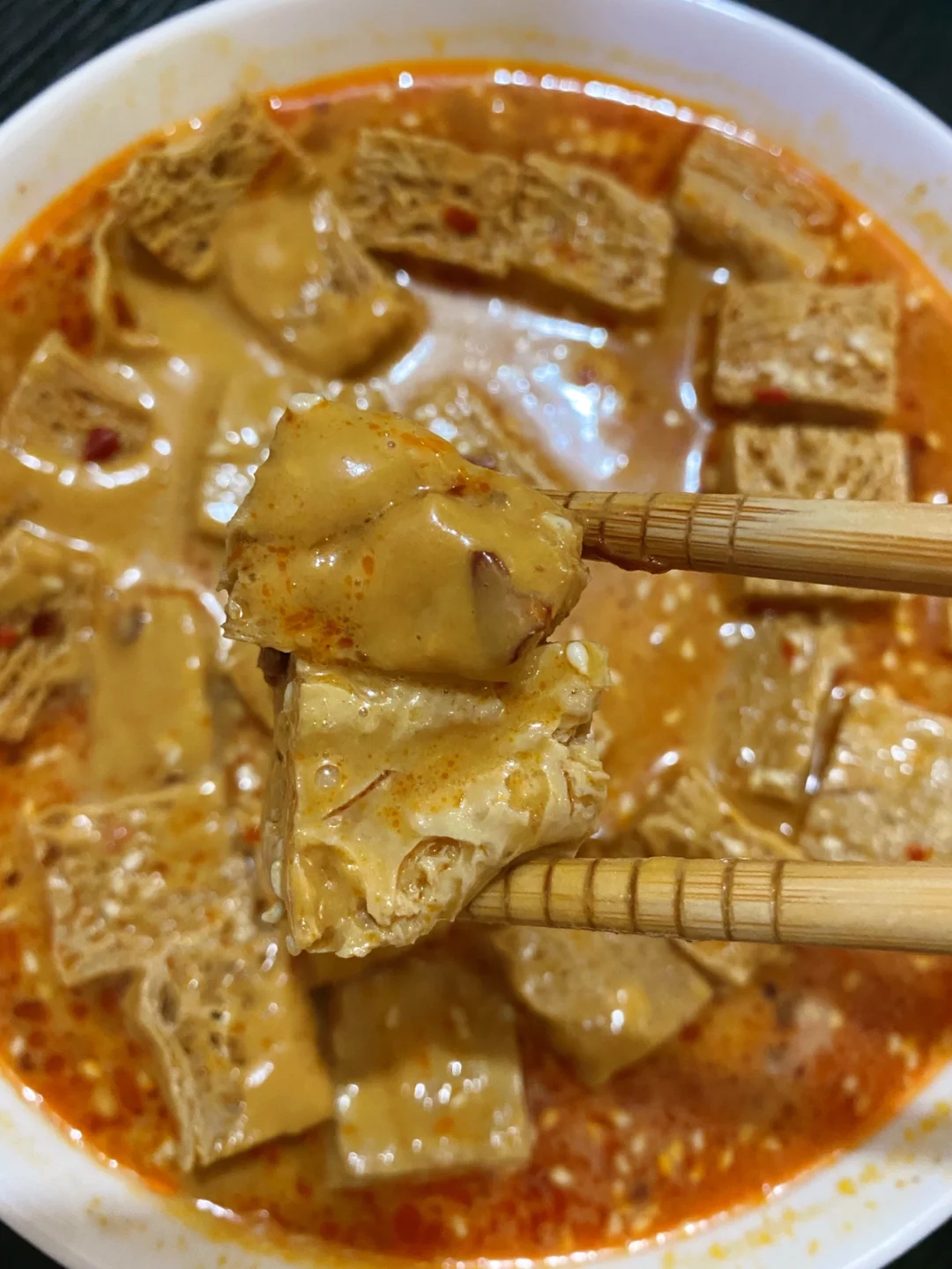 跟外面的小吃摊一样!! 太好吃啦!! 1⃣️油锅炒火锅底料、姜片、蒜、八角,炒出红油之后加入热水,水开之后加入冻豆腐大火煮5分钟 2⃣️芝麻酱用水和开,加入盐、白糖、生抽、陈醋、辣椒油、花椒油、白芝麻搅匀,倒在煮好的冻豆腐上 完成✅ 哇!! 满满的都是汤汁 裹上芝麻酱好浓郁!!