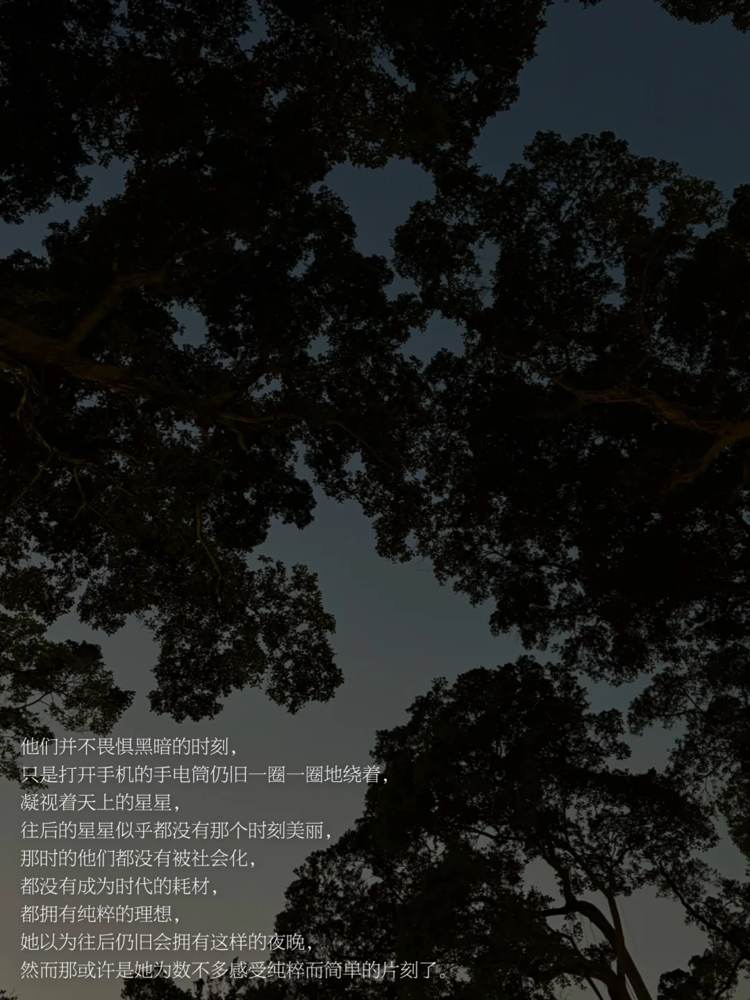 那时候,遇见的人也是抱有同样幻想的人,他们无数次在深夜时漫步在校园的角落,去谈论自己内心的理想,去诉说自己的过往经历,他们会在这样平静的夜晚里散步、流泪、大笑,仿佛周遭事物都因为彼此的存在变得愈发闪耀,我仍旧记得那次与他们散步到操场熄灯的夜晚,我们不畏惧黑暗的时刻,凝视着天上的星星,往后的星星似乎都没有那个时刻美丽。