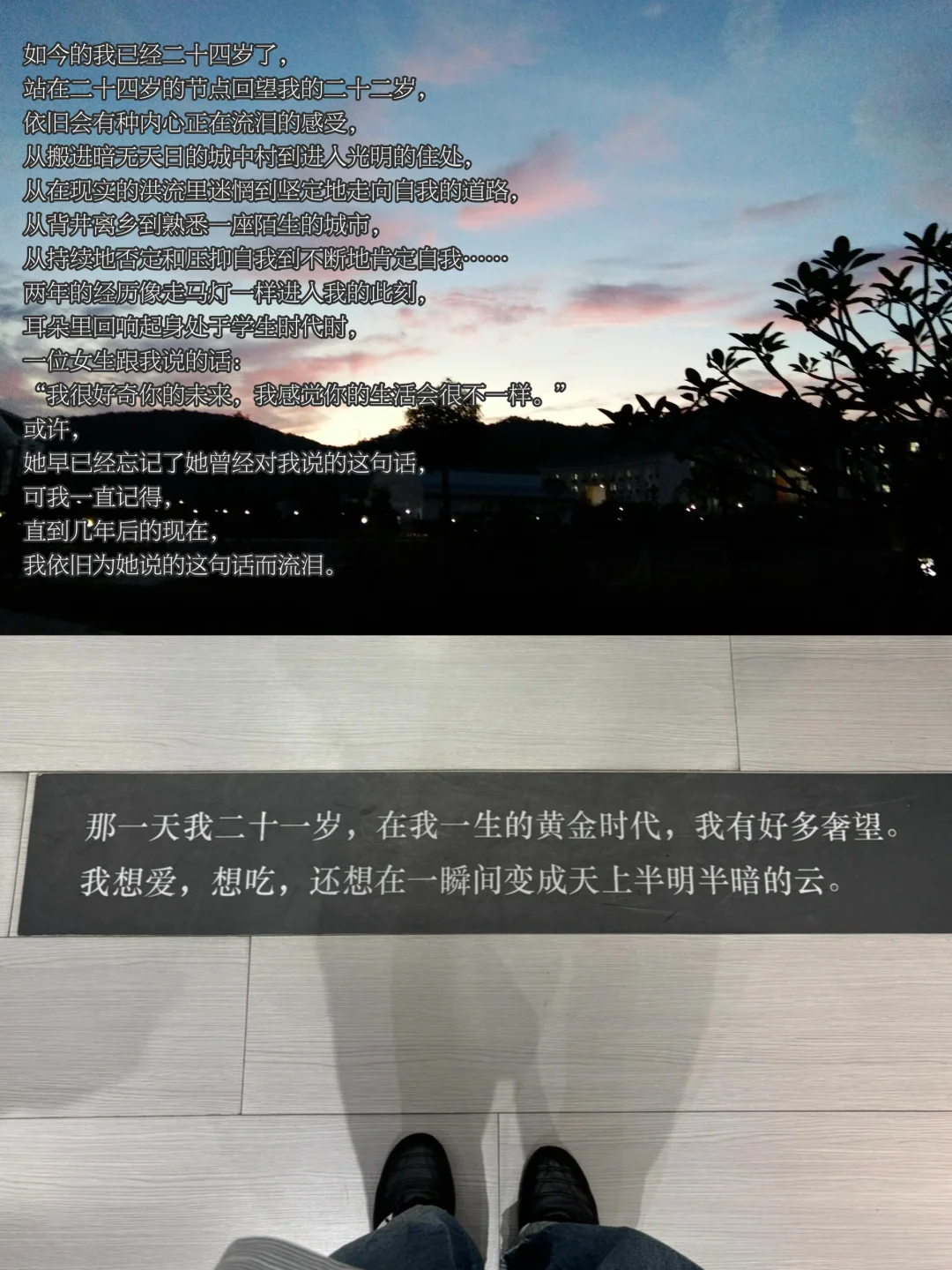 也许人生多有不如意,但我想说的是,我们都不要害怕独自漂泊和生长的历程,我们终将会度过那些至暗时刻,成长为自己想成为的大人,这这也是我想告诉那个二十二的我,以后的以后,你会拥有闪闪发光的未来。