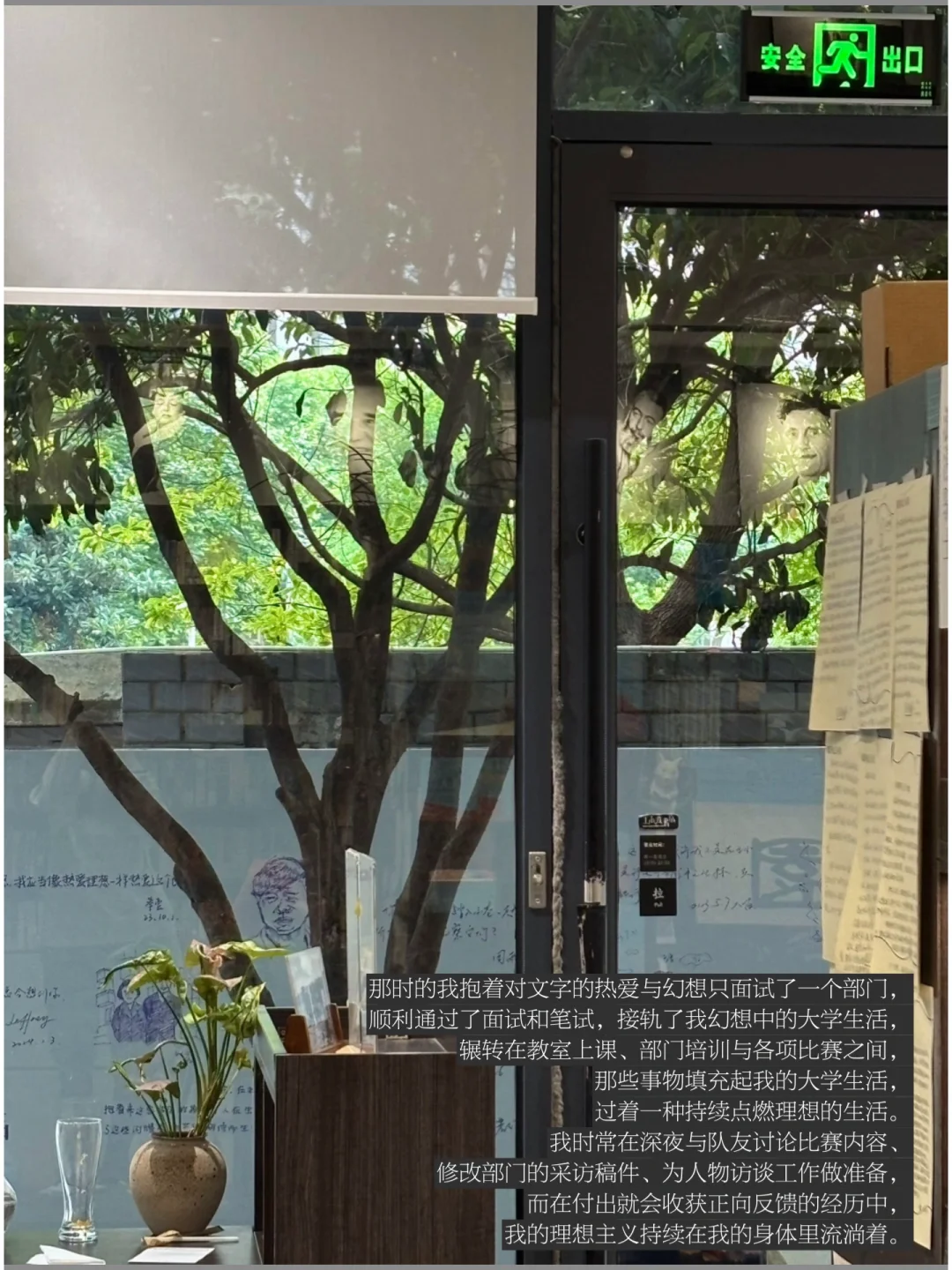 那时的我抱着对文字的热爱与幻想只面试了一个部门,顺利通过面试和笔试,接轨了我幻想中的大学生活,辗转在教室上课、部门培训与各项比赛之间,那些事物填充起我的大学生活,过着一种持续点燃理想的生活。我时常在深夜与队友讨论比赛内容、修改部门的采访稿件、为人物访谈工作做准备,在付出就会收获正向反馈的经历中,我的理想主义持续在我的身体里流淌着。