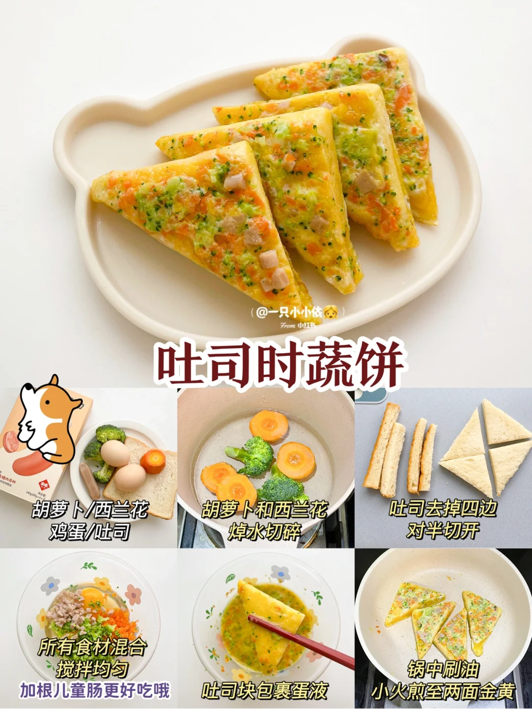 🔸步骤:胡萝卜和西兰花焯水切碎;吐司去掉四边,对半切开;所有食材混合搅拌均匀;吐司块包裹蛋液,锅中刷油,小火煎至两面金黄✅
