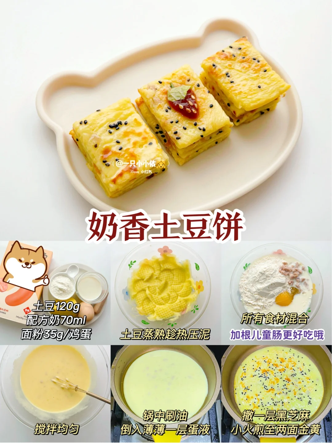 🔸步骤:土豆蒸熟趁热压泥,所有食材混合搅拌均匀;锅中刷油倒入薄薄一层蛋液,撒一层黑芝麻,小火煎至两面金黄✅