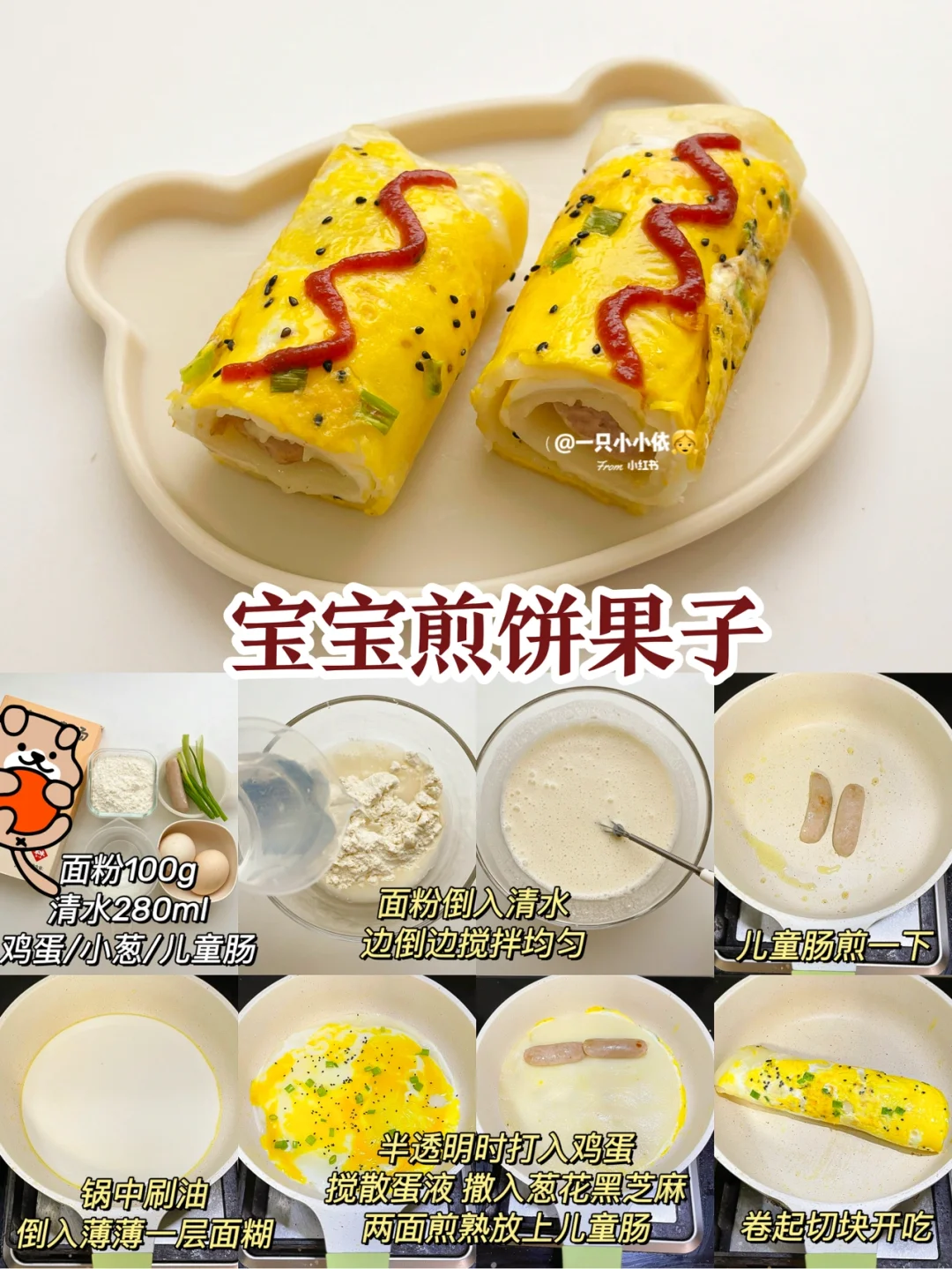 🔹食材:面粉100g、清水280ml、鸡蛋、小葱、儿童肠