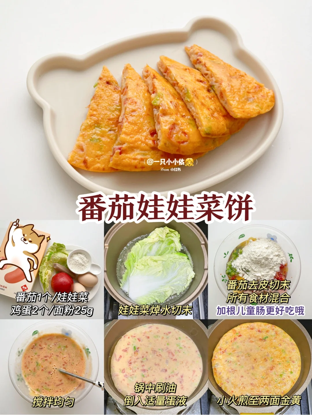 🔸步骤:娃娃菜焯水切末,番茄去皮切末,所有食材混合搅拌均匀(加根儿童肠更好吃哦);锅中刷油倒入适量蛋液,小火煎至两面金黄✅