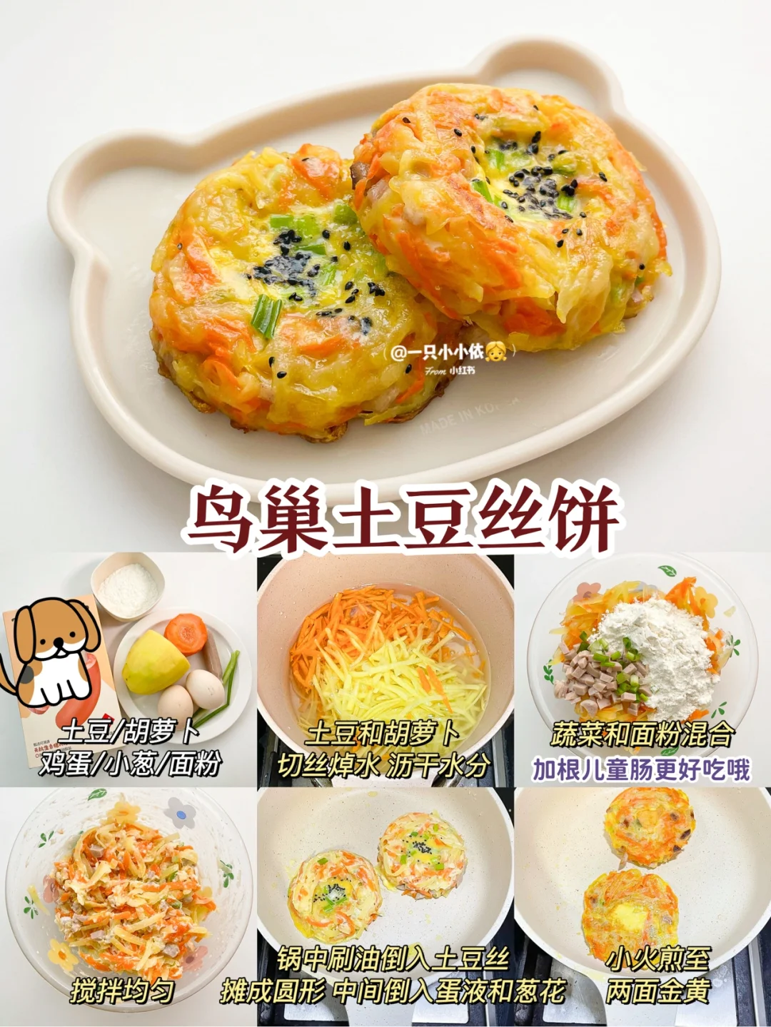 🔸步骤:土豆和胡萝卜切丝焯水,沥干水分;蔬菜和面粉混合搅拌均匀(加根儿童肠更好吃哦);锅中刷油倒入土豆丝,摊成小饼,中间倒入蛋液和葱花,小火煎至两面金黄✅