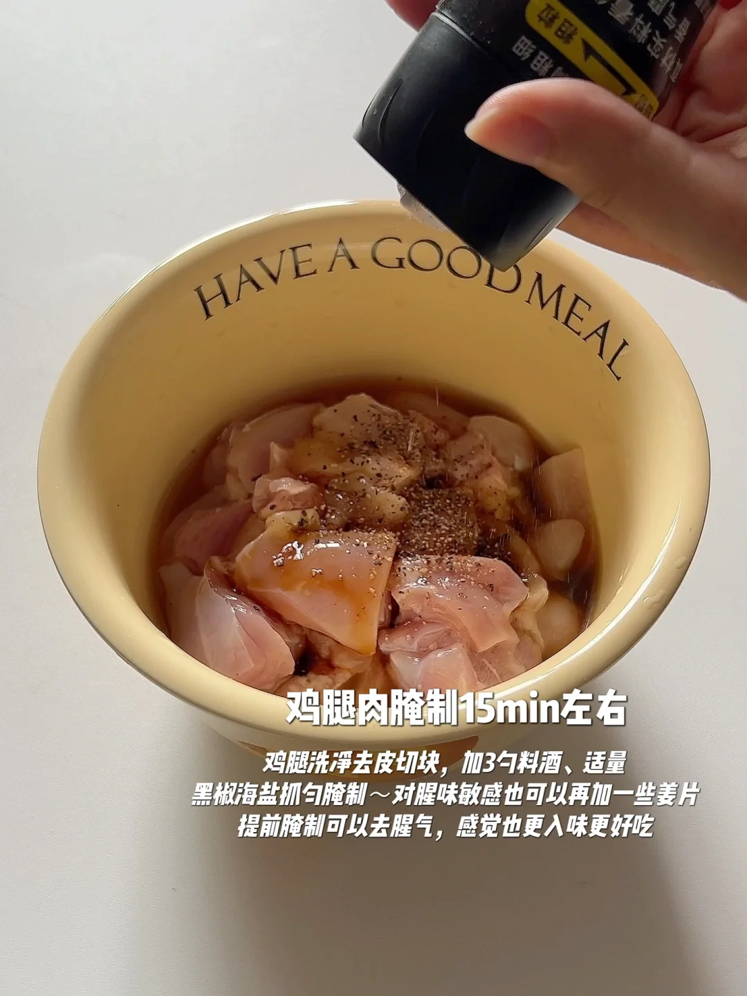 1⃣️ 鸡腿洗净去皮切块,加3勺料酒、适量黑椒海盐,拌匀腌制15min左右(如果对腥味比较敏感,可以另外加一些姜片一起腌制);