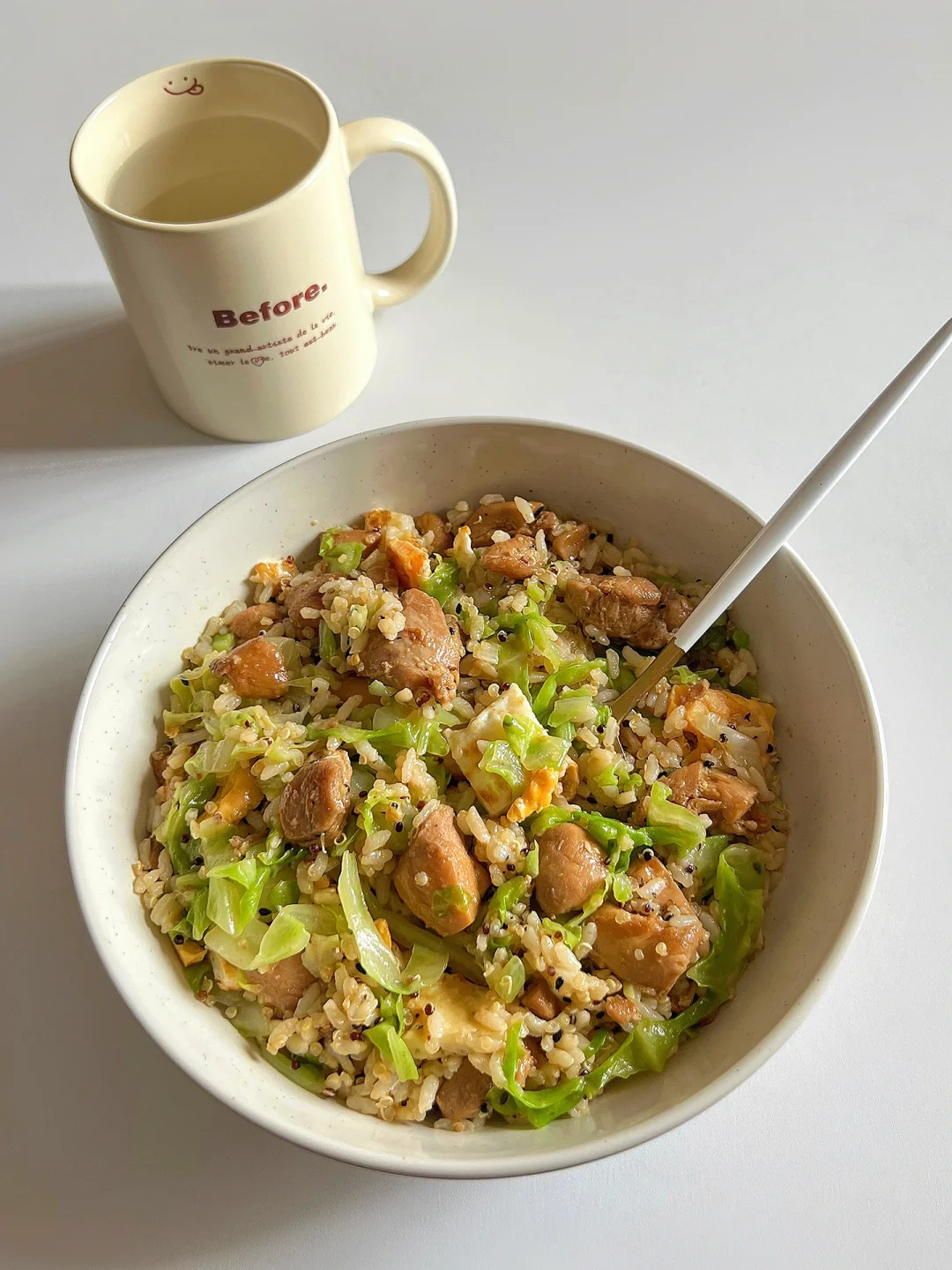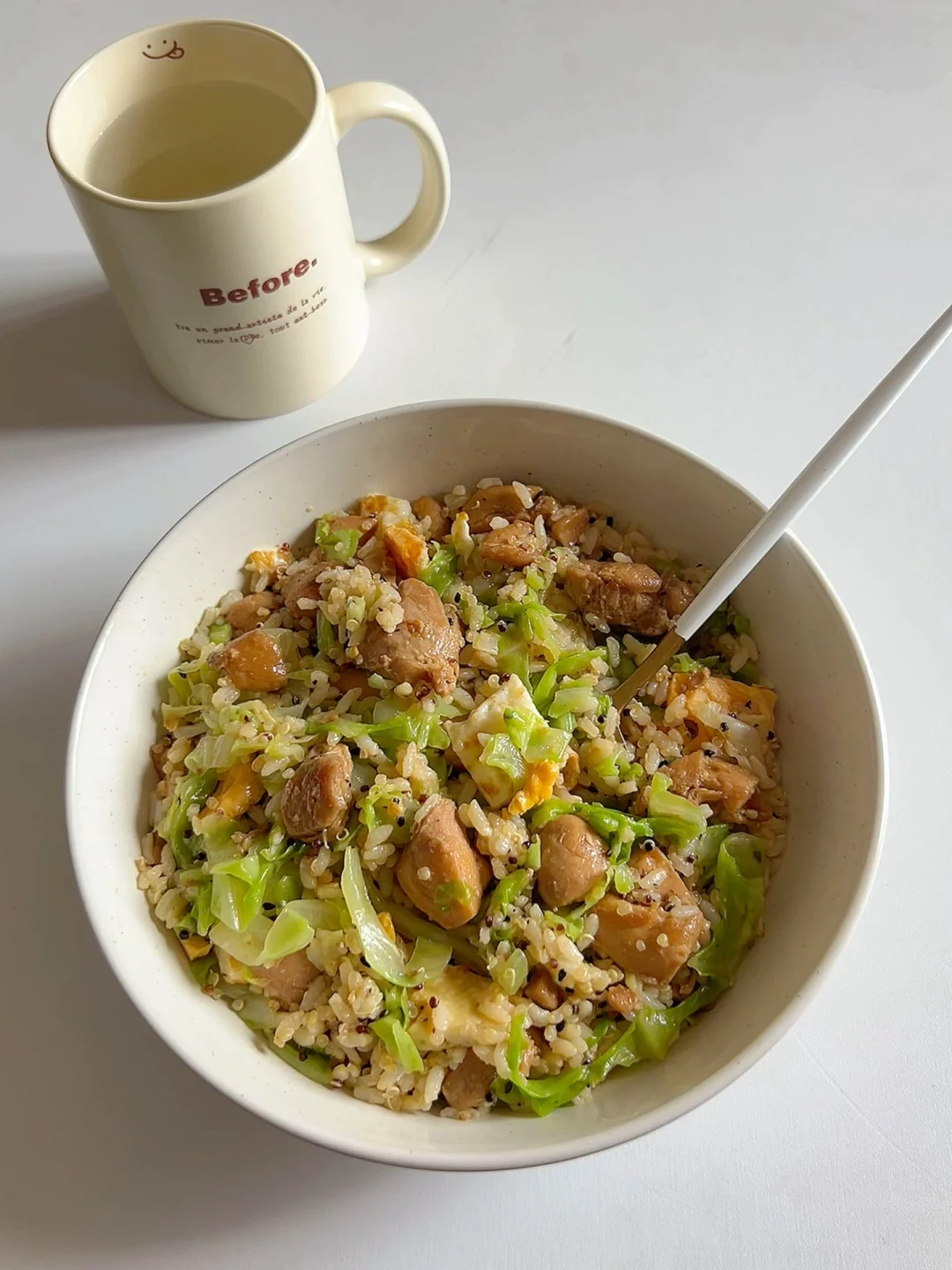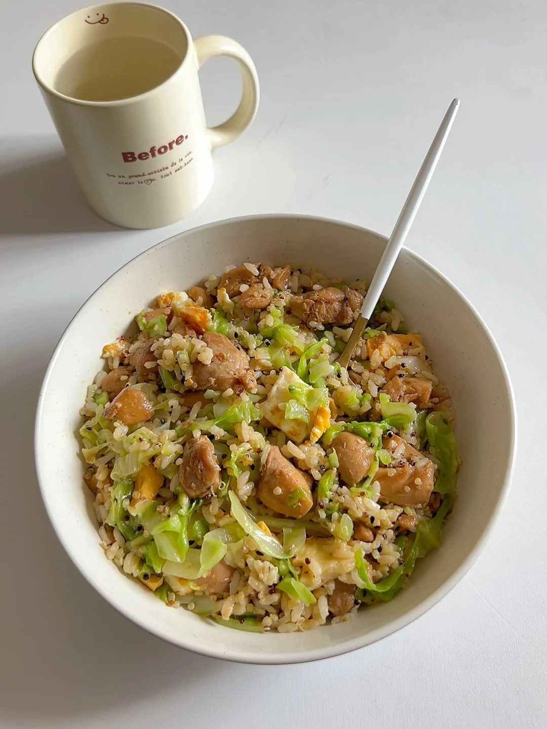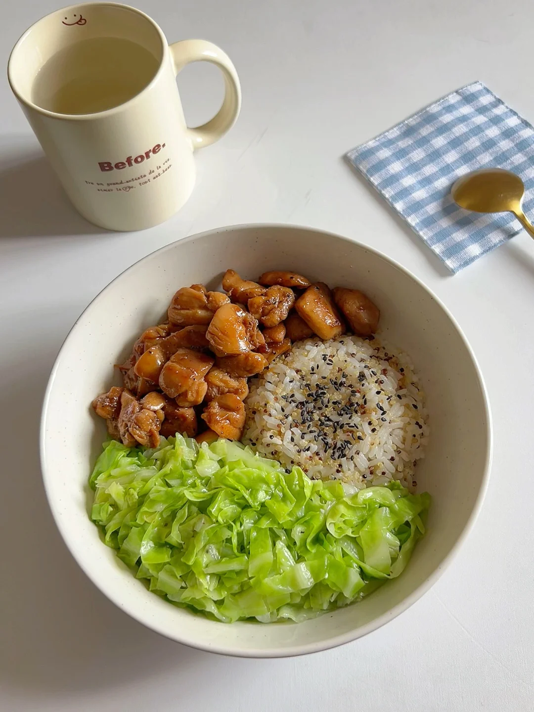 今天吃的是黑椒照烧鸡肉➕包菜丝➕煎蛋拌饭,做起来很简单!