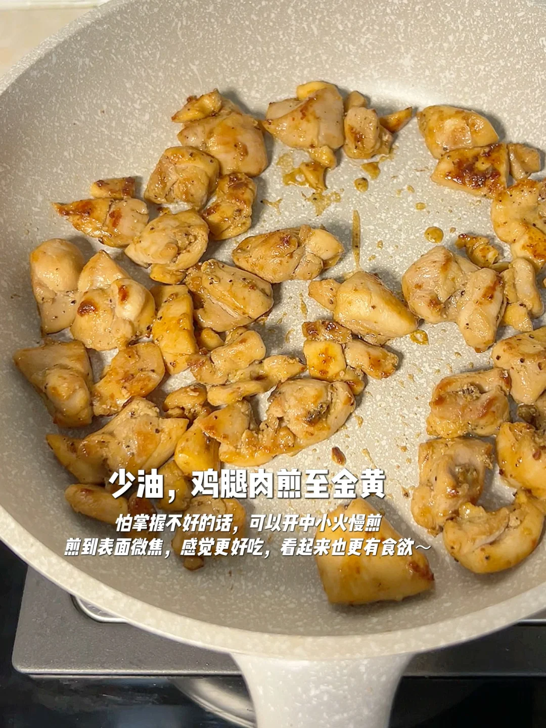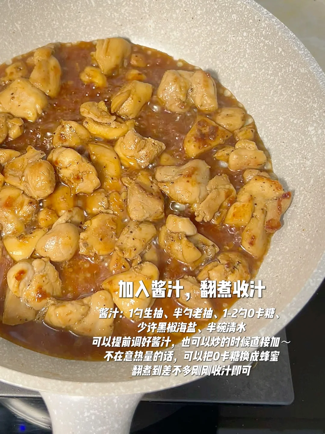 2⃣️ 锅中少油,鸡腿肉煎至表面金黄微焦,然后加入1勺生抽、半勺老抽、1-2勺0卡糖、少许黑椒海盐、半碗清水,翻煮到差不多收汁;