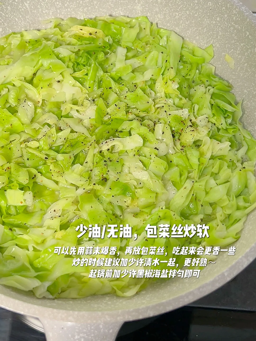 3⃣️ 锅中少油/无油,放入包菜丝和少许清水炒软,起锅前加少许黑椒海盐拌匀即可;