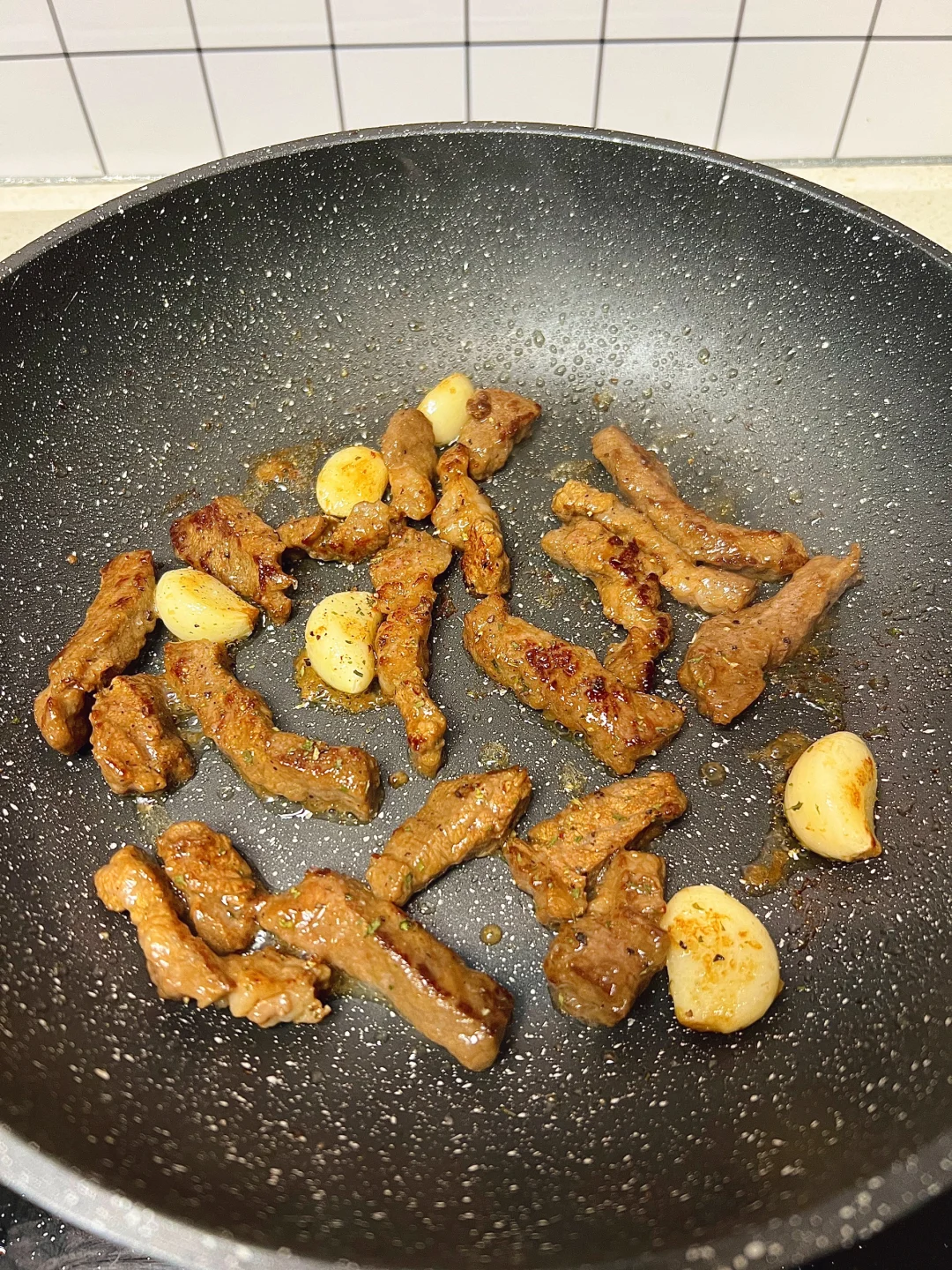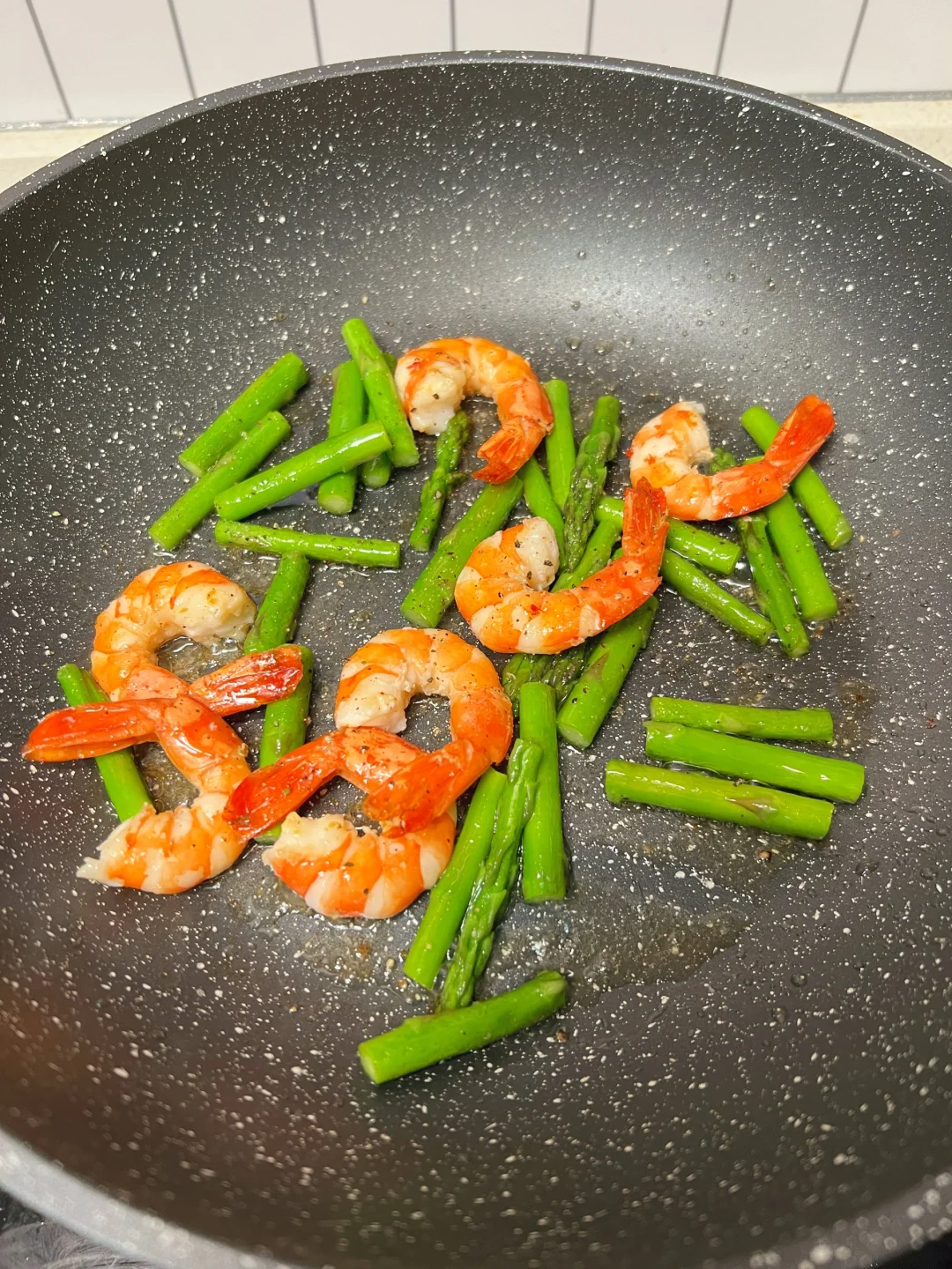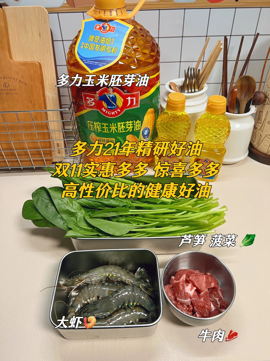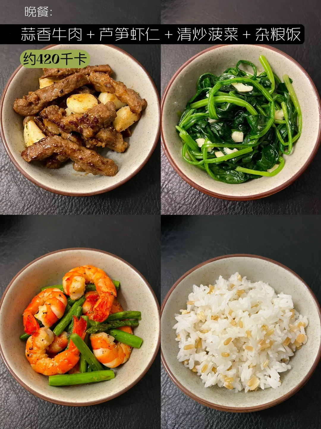 晚餐:🥣料汁虾仁+芦笋煎牛肉+清炒菠菜+杂粮饭