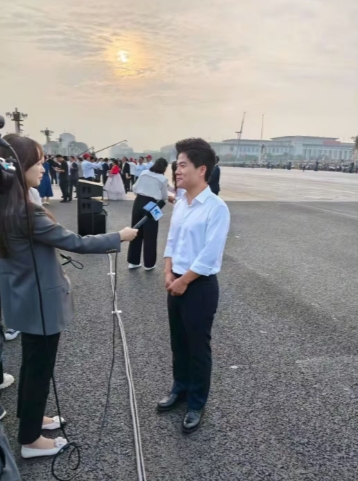 董宇辉在天安门接受新华社张扬访问 现场的他,白衬衫黑西裤皮鞋, 一如既往的简单清