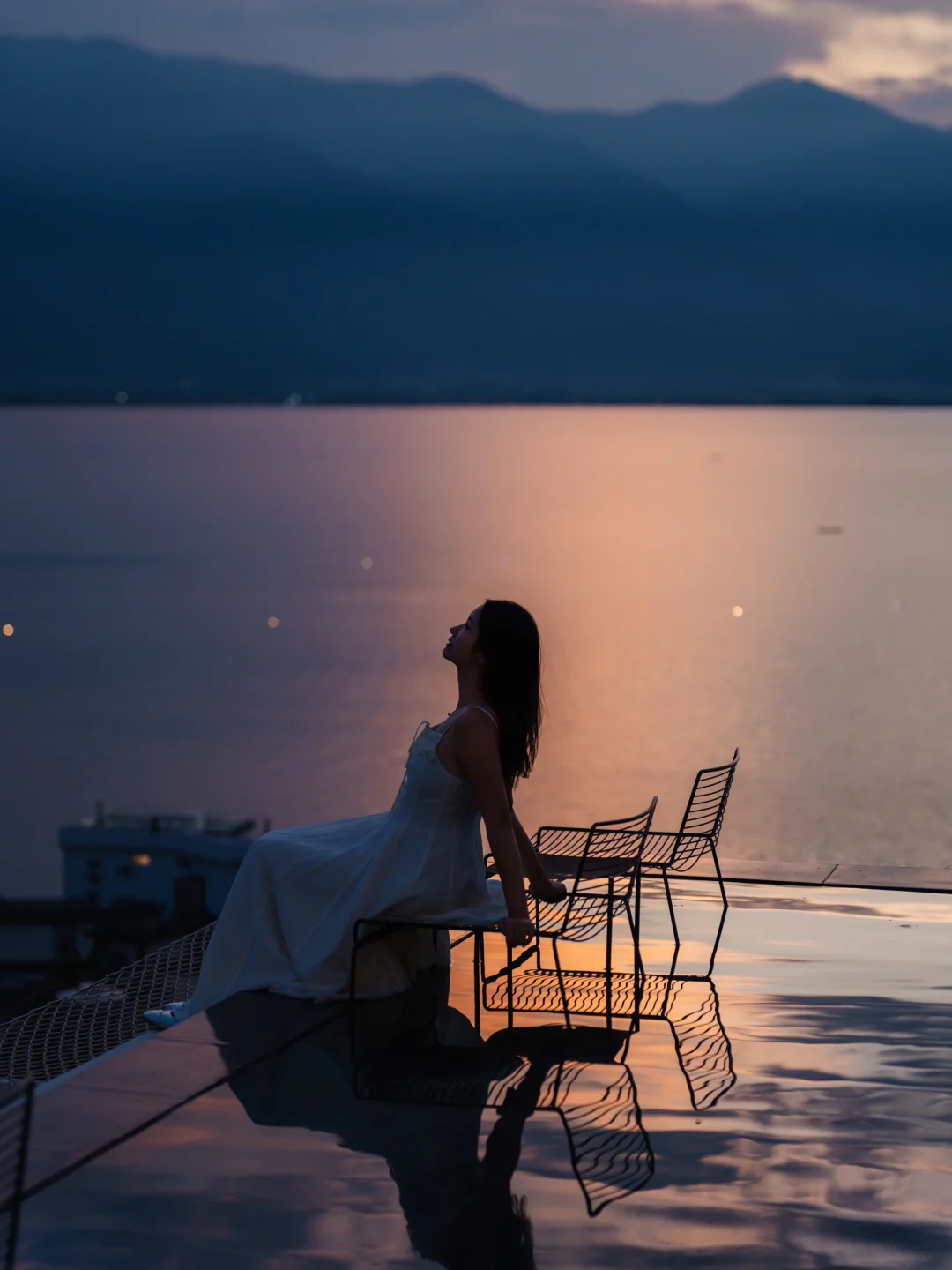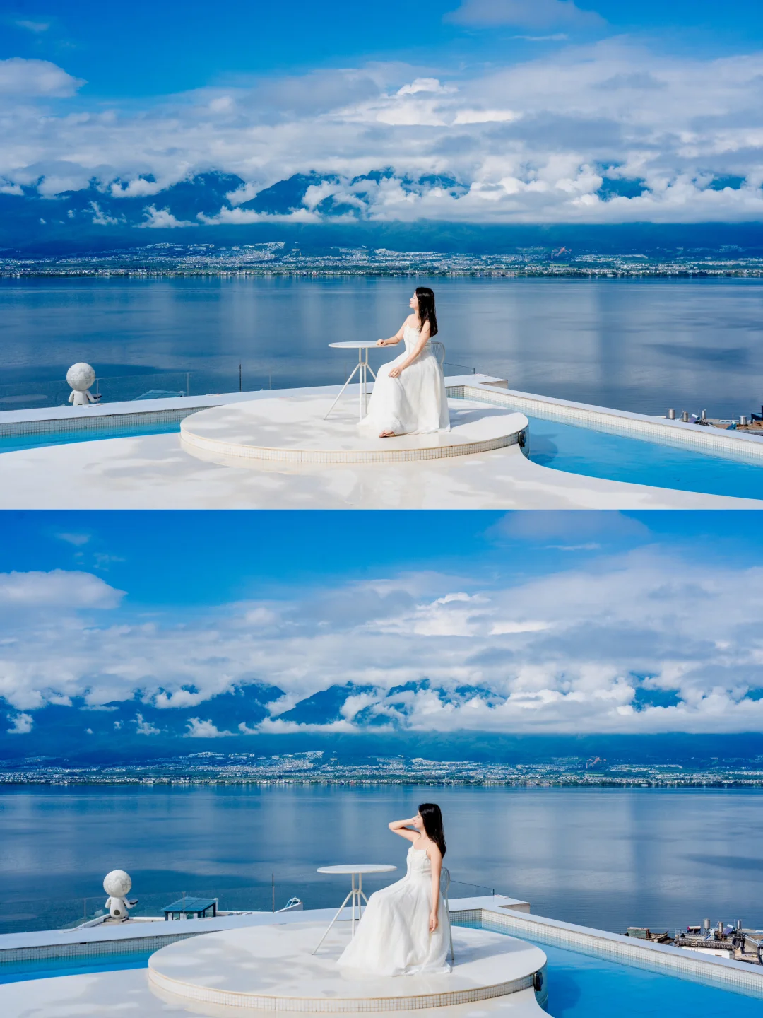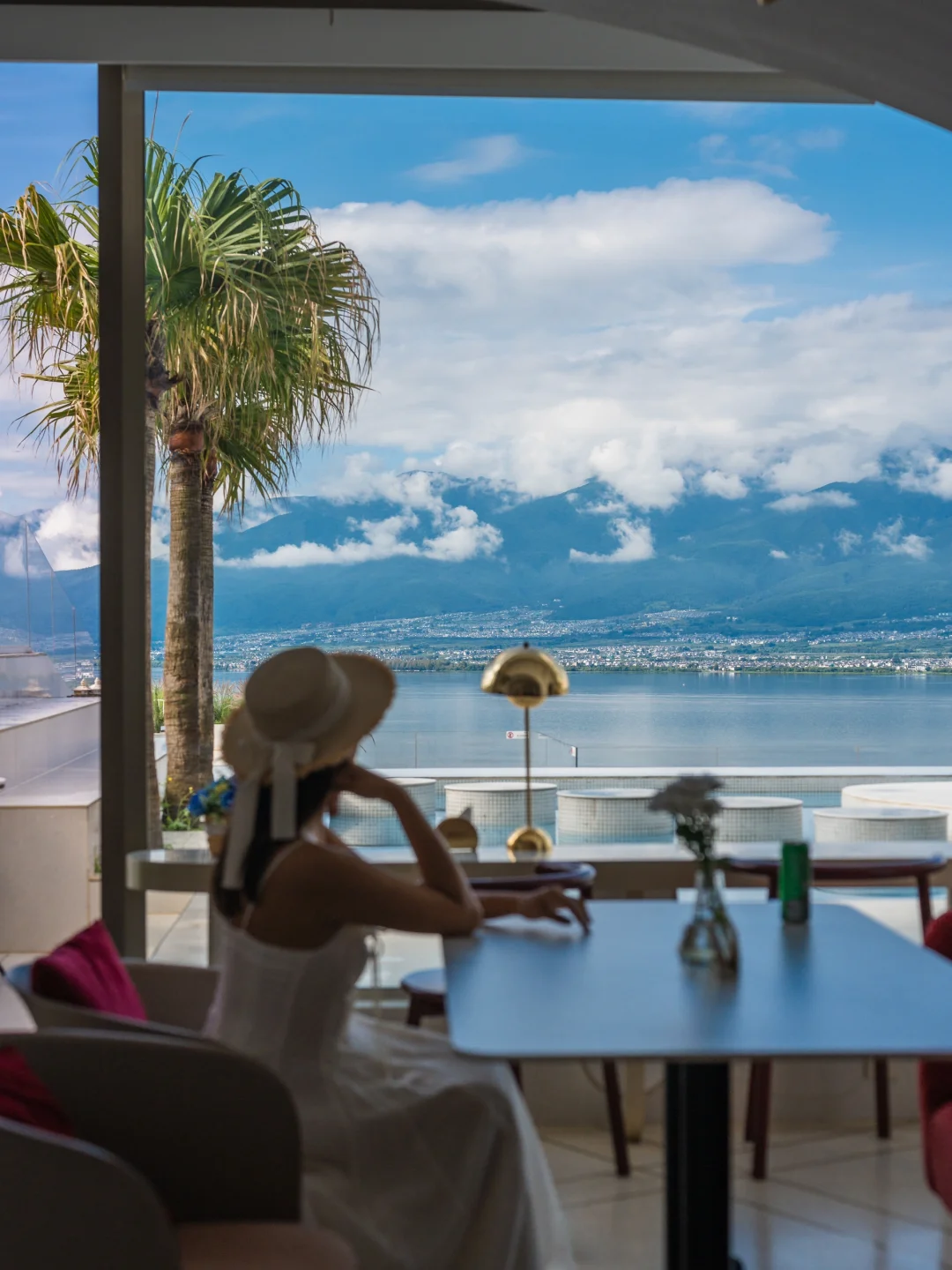 站在三楼天井处,从上往下拍,可以拍出复古欧式美照。四楼大厅和露台早上9点拍远处苍山的云朵,傍晚六点以后拍这个季节独有的洱海渔灯、拍夕阳落日,一整个绝绝子!