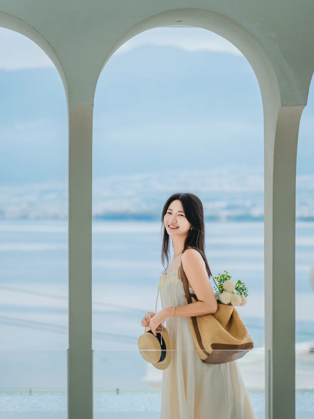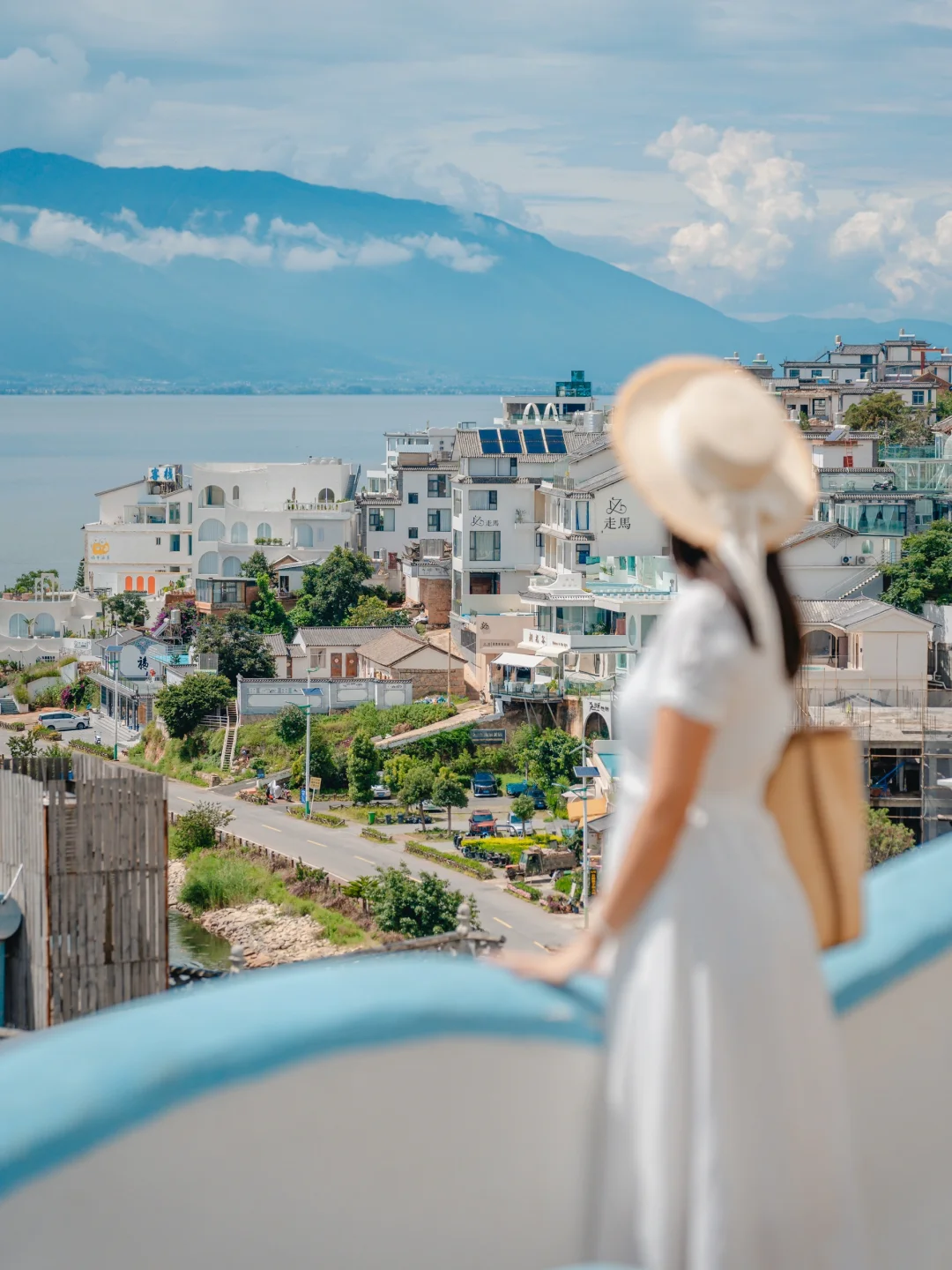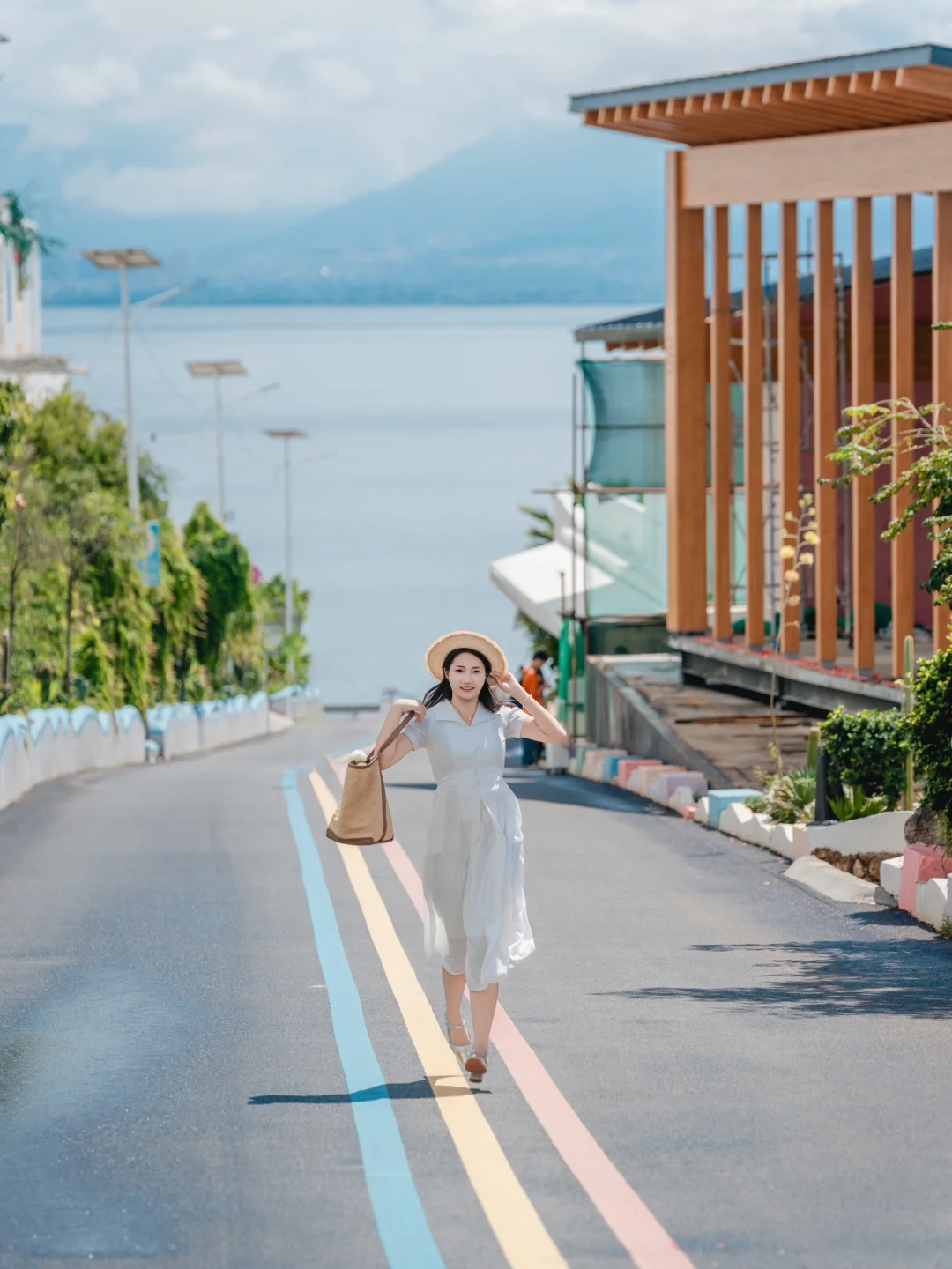 从高往下拍,可以拍出彩虹公路通向海边的感觉。路边向远处拍到洱海和临海的小房子,可以拍出圣托里尼的感觉!