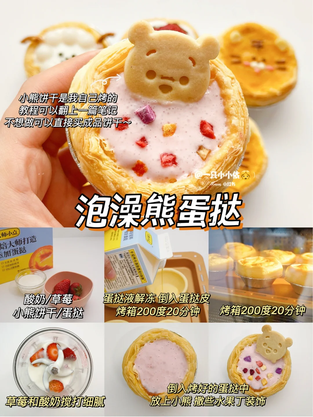 🔹步骤:蛋挞液解冻,倒入蛋挞皮,烤箱200度20分钟;酸奶喝草莓搅打细腻,倒入烤好的蛋挞中,放上小熊饼干,撒些水果丁装饰