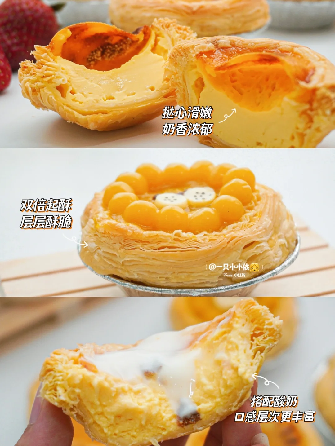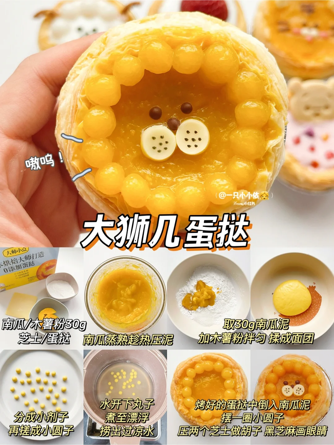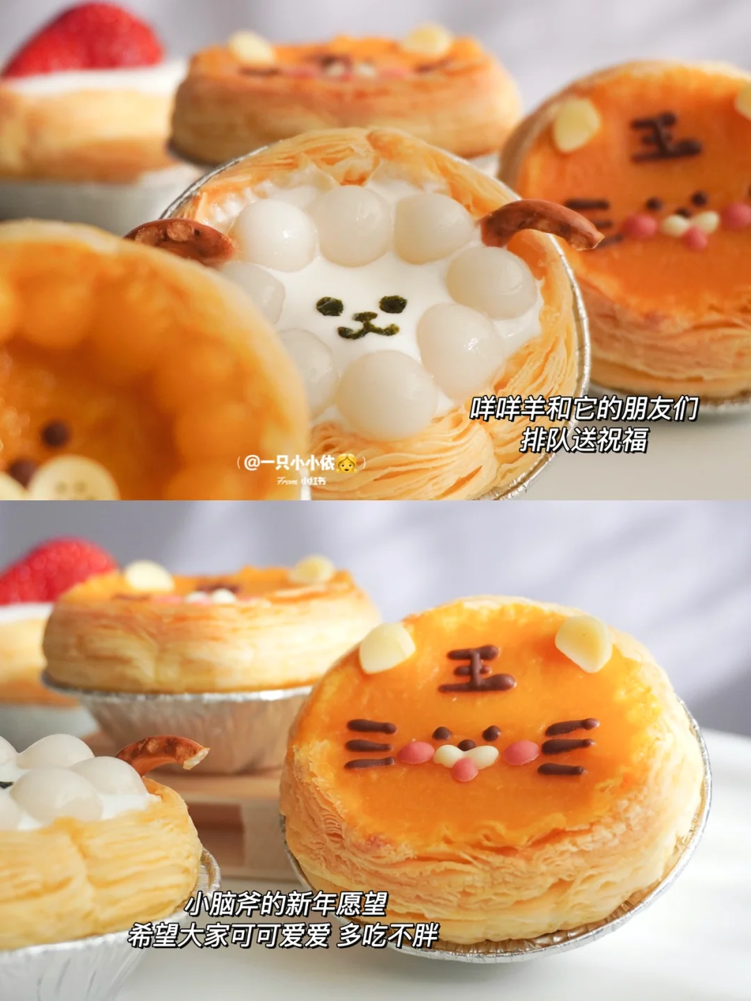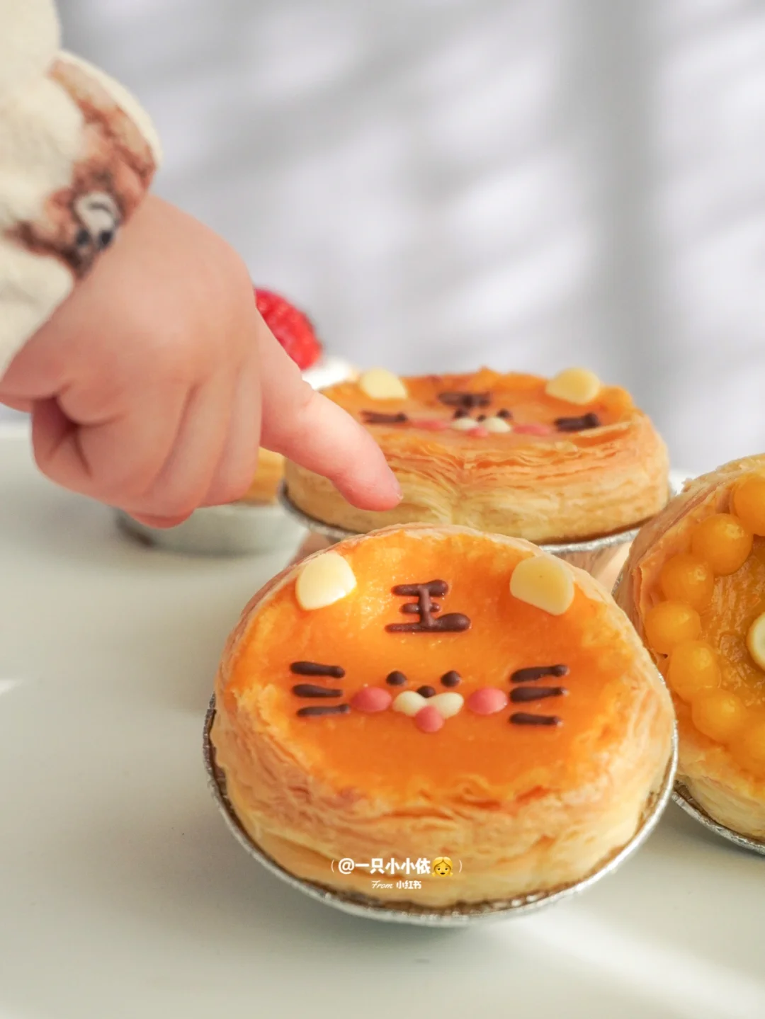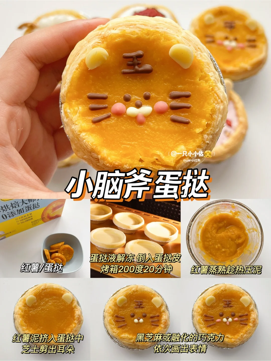 🔹步骤:蛋挞液解冻,倒入蛋挞皮,烤箱200度20分钟;红薯蒸熟趁热压泥,挤入烤好的蛋挞中,芝士剪出耳朵,黑芝麻或融化的巧克力画表情