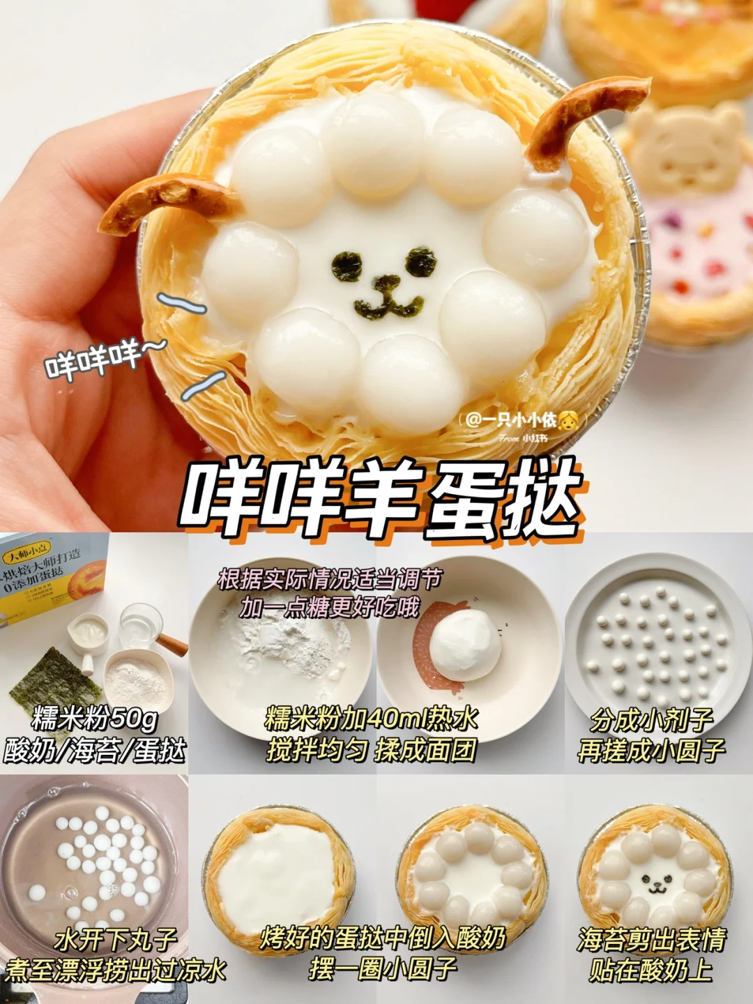 🔹步骤:糯米粉加40ml热水,搅拌均匀揉成面团,分成小剂子再搓成小圆子,水开下圆子,煮至漂浮捞出过凉水;烤好的蛋挞中倒入酸奶,摆一圈小圆子,海苔剪出表情放在酸奶上