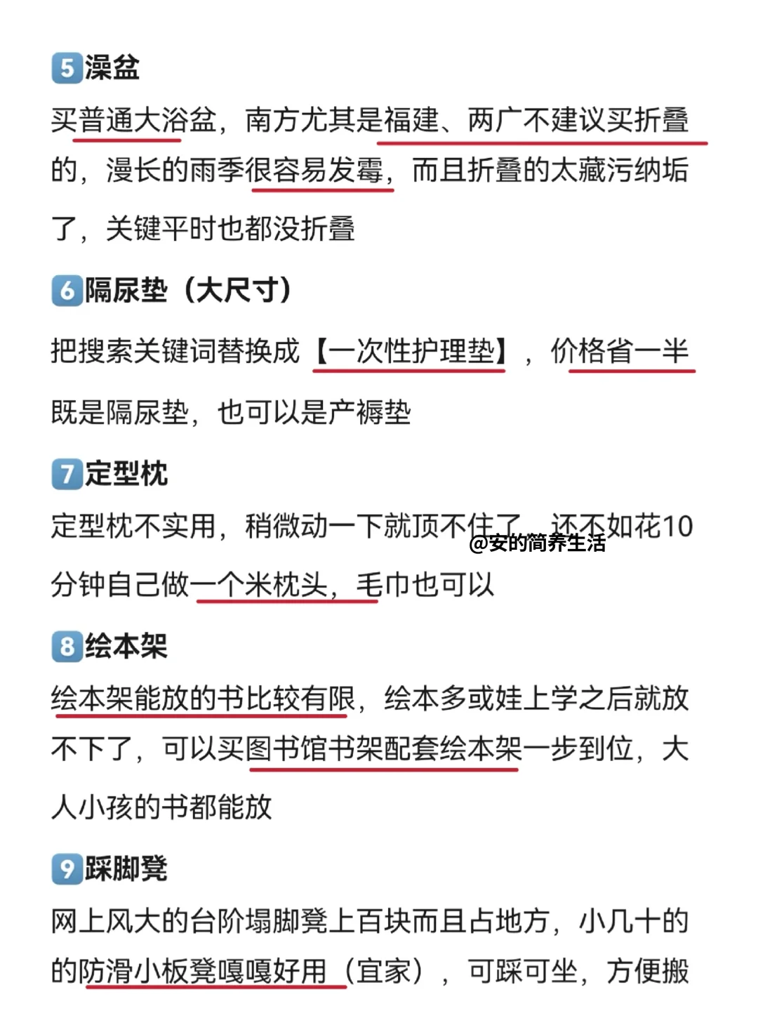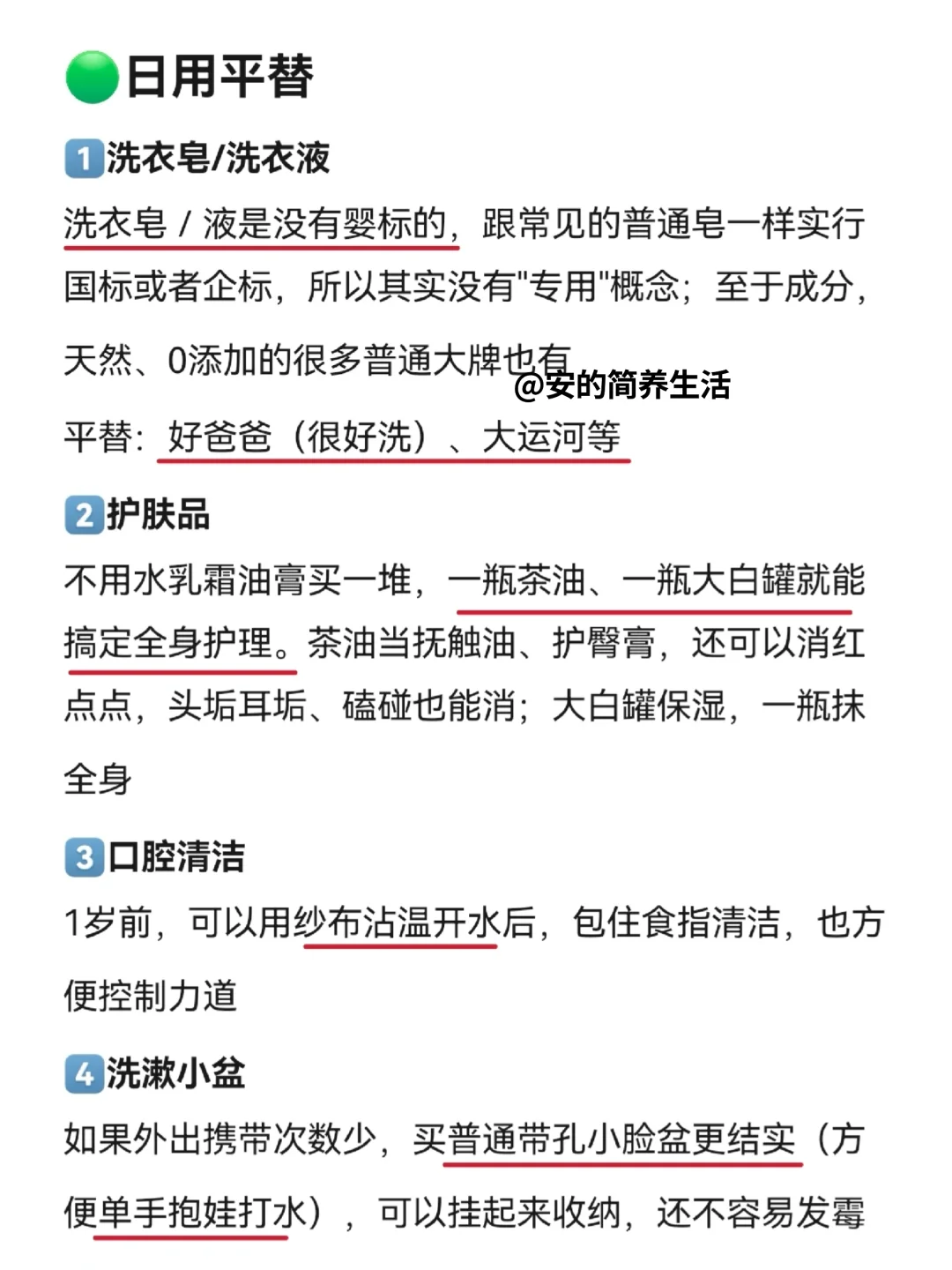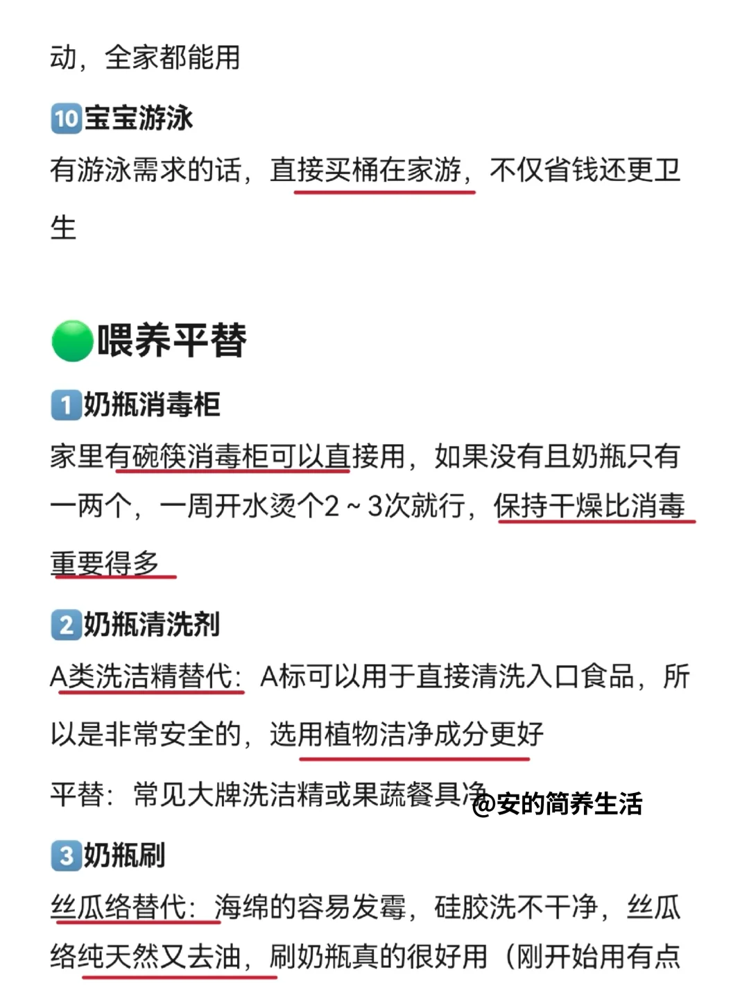 新增版 ——— 《消费主义如何操控我们》一书中分析到:“消费主义寄希望于消费者的非理性,而不是他们完全知情和清醒的计算; 寄希望于唤起消费主义情绪,而不是培养理智。” “非理性”、“不完全知情”、“唤起情绪”,每一个词都无比贴合新手妈妈的消费心理,母婴商家深谙此道,疯狂营销“养娃必备”、“孕妇/婴儿专用”、“宝宝必需”等消费陷阱,让我们觉得需要它,甘心情愿的掏空钱袋买买买。 . 养娃2年多,边踩坑边领悟,学会了透过现象看本质,发现很多母婴用品其实不需要买或者不需要买专用的,物尽其用或买普通的,一样实用,且很省钱。 . 根据自己实践经验总结了48条替代思路供参考,希望对你有帮助 但每个家庭的生活习惯、消费观不同,不一定都适用,有选择的理性参考 以上,就是今天的内容 下期见~ .