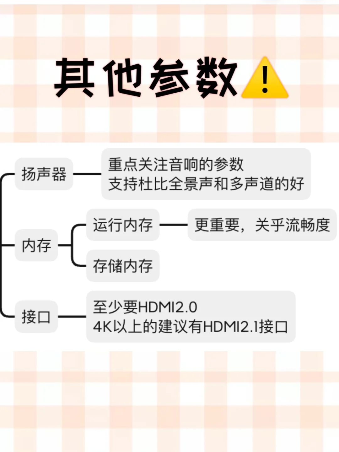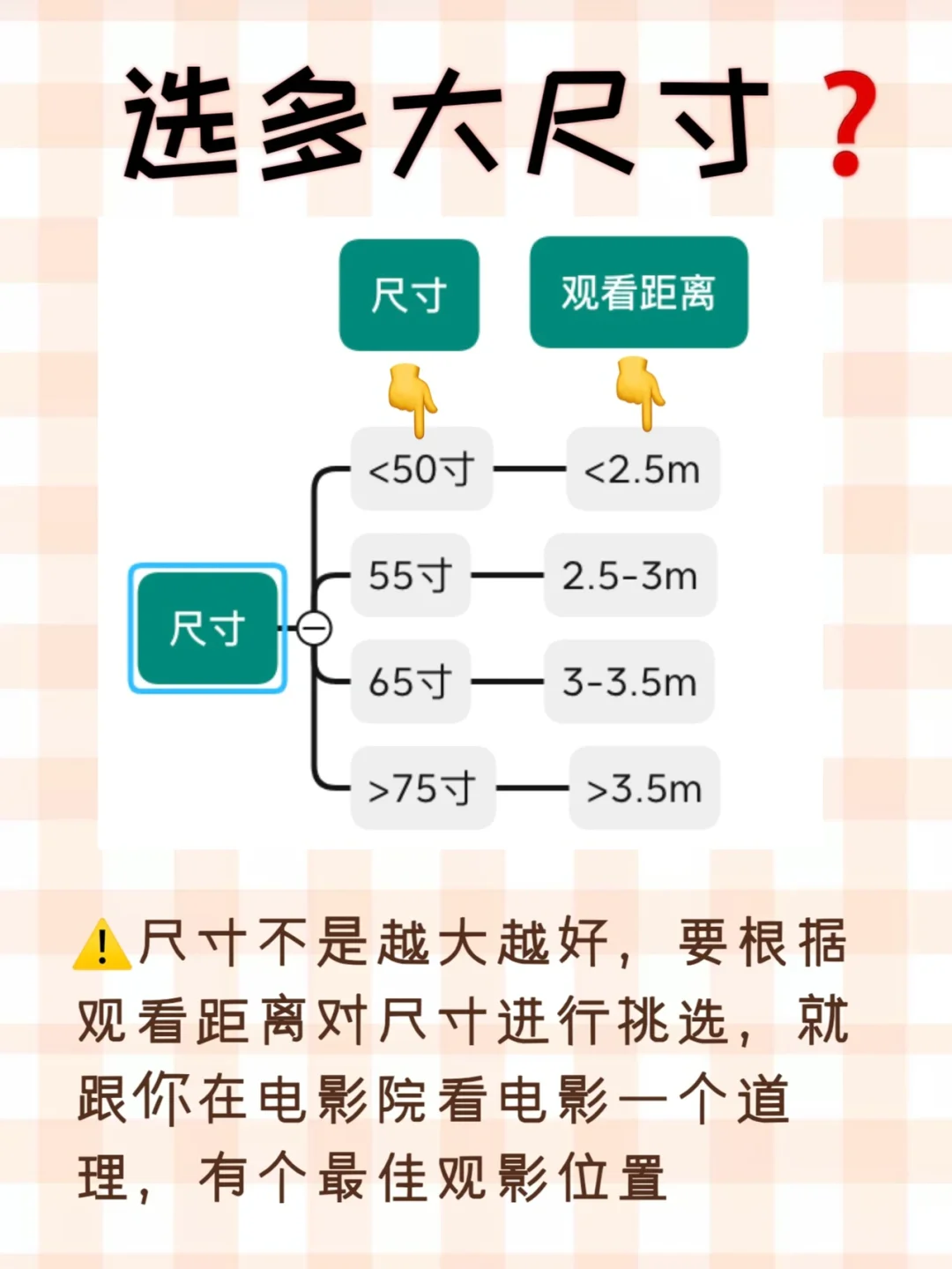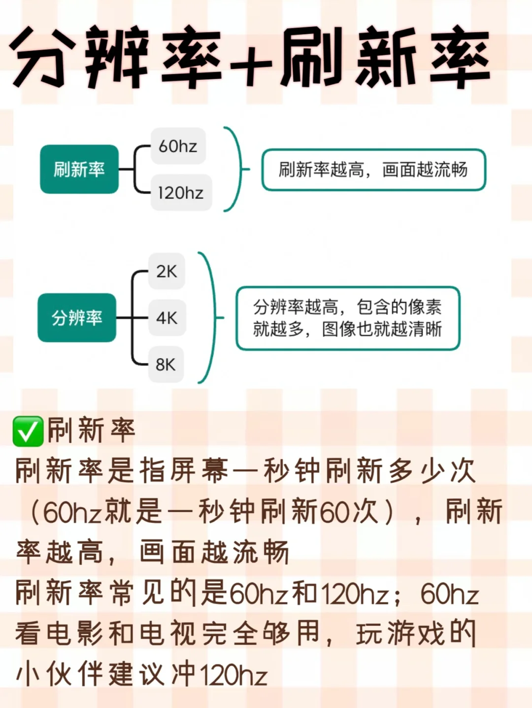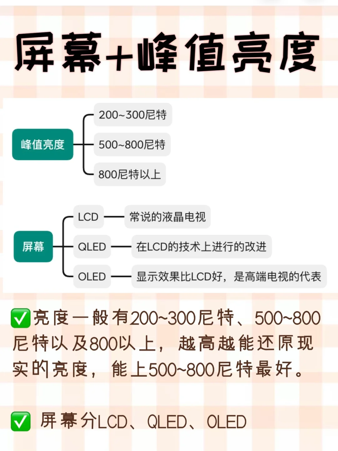 前几天有宝子说家里要买电视,问能不能出一期怎么挑电视机的干货 [暗中观察R]宠粉博主必须安排啊~只要是大家居领域的,就没有我不做的功课(😏牛轰轰.gif) 上干货👇 🌈家用电器重点看参数,看配置 1️⃣尺寸到底买多大的? 尺寸不是越大越好,要根据观看距离对尺寸进行挑选,就跟你在电影院看电影一个道理,有个好的观影位置 尺寸 观看距离 👇 👇 3.5米---75寸以上 2️⃣看分辨率 分辨率越高,包含的像素就越多,图像也就越清晰 分辨率现在一般是2k、4k、8K 3⃣️看刷新率 刷新率是指屏幕一秒钟刷新多少次(60hz就是一秒钟刷新60次),刷新率越高,画面越流畅 刷新率常见的是60hz和120hz;60hz看电影和电视完全够用,玩游戏的小伙伴建议冲120hz 4⃣️看色域 色域就是指电视能显示的颜色范围,色域越高,覆盖率越高,色彩也就越丰富,画质越细腻 色域也有好几种标准,RGB、NTSC、DCI-P3,具体不啰嗦,对照下面几个参数: 普通:90%sRGB 普通:72%NTSC Good:90%NTSC Good: 90%DCI-P3(索尼中高端配置) 5⃣️看峰值亮度 亮度一般有200~300尼特、500~800尼特以及800以上,越高越能还原现实的亮度,能上500~800尼特更好 6⃣️MEMC运动防抖技术和HDR👆看图5 7⃣️看屏幕 屏幕分LCD、QLED、OLED LCD:主流,也就是常说的液晶电视 QLED:只是在LCD的技术上进行的改进,本质上还是LCD OLED:对比度高,可视角度广,延迟低,显示效果比LCD好,是高端电视的代表 8⃣️其他参数 扬声器🔉内存、接口,具体看图7⬆️ 好啦,暂时整理这么多啦,小伙伴们根据自己的预算,可以去线下体验,看准参数,线上[买爆R][买爆R][买爆R]更划算哦[暗中观察R] 🎈我是小十一,分享一些自己知道的电商行业干货 📒还想看什么可以评论区告诉我~我来出干货[暗中观察R] 🌈Jio的有用的话记得点点赞哦[扯脸H]溜了溜了[吧唧R]