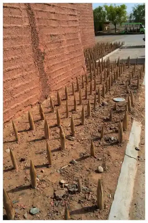 在长城墙脚下,还有一种名叫“虎落”的设施,即用红柳枝编成的一道篱笆墙,或者用将木杆的一头削尖,以60~70厘米的间隔,垂直埋设于夯土建筑周围,用来扎伤经过的人马,阻止敌军进攻。