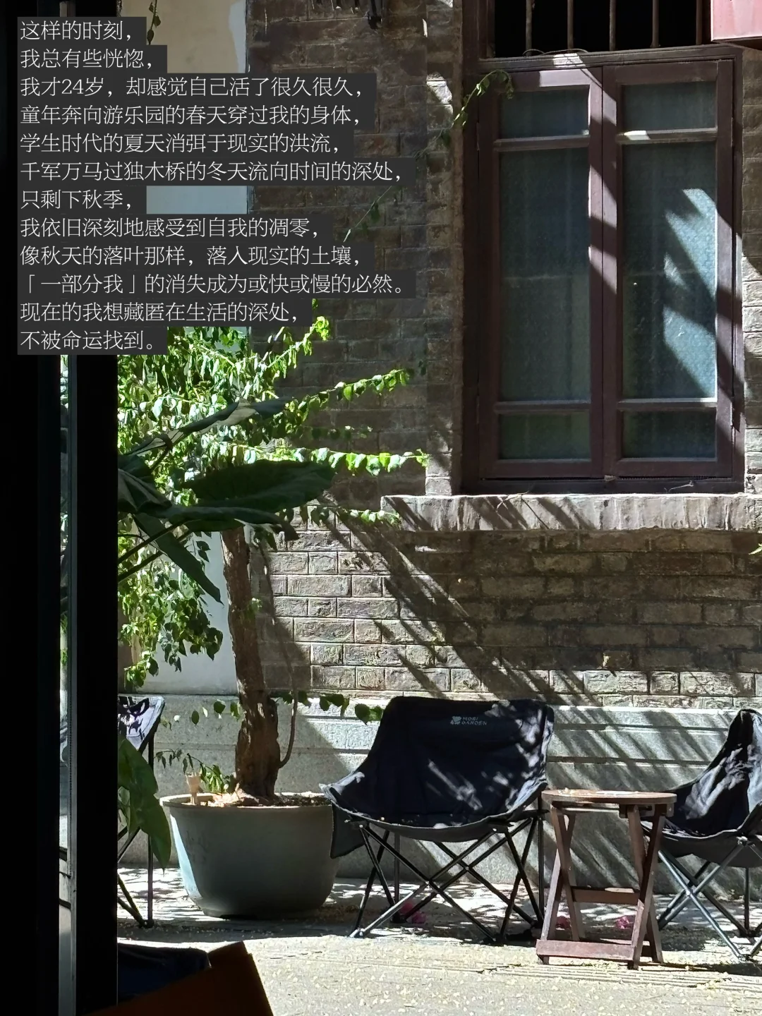 这样的时刻,我总有些恍惚,我才24岁,却感觉自己活了很久很久,童年奔向游乐园的春天穿过我的身体,学生时代的夏天消弭于现实的洪流,千军万马过独木桥的冬天流向时间的深处,只剩下秋季,我依旧深刻地感受到自我的凋零,像秋天的落叶那样,落入现实的土壤,一部分我的消失成为或快或慢的必然。现在的我想藏匿在生活的深处,不被命运找到。