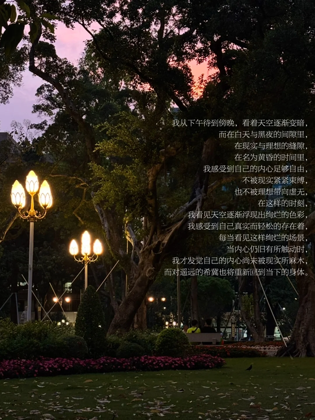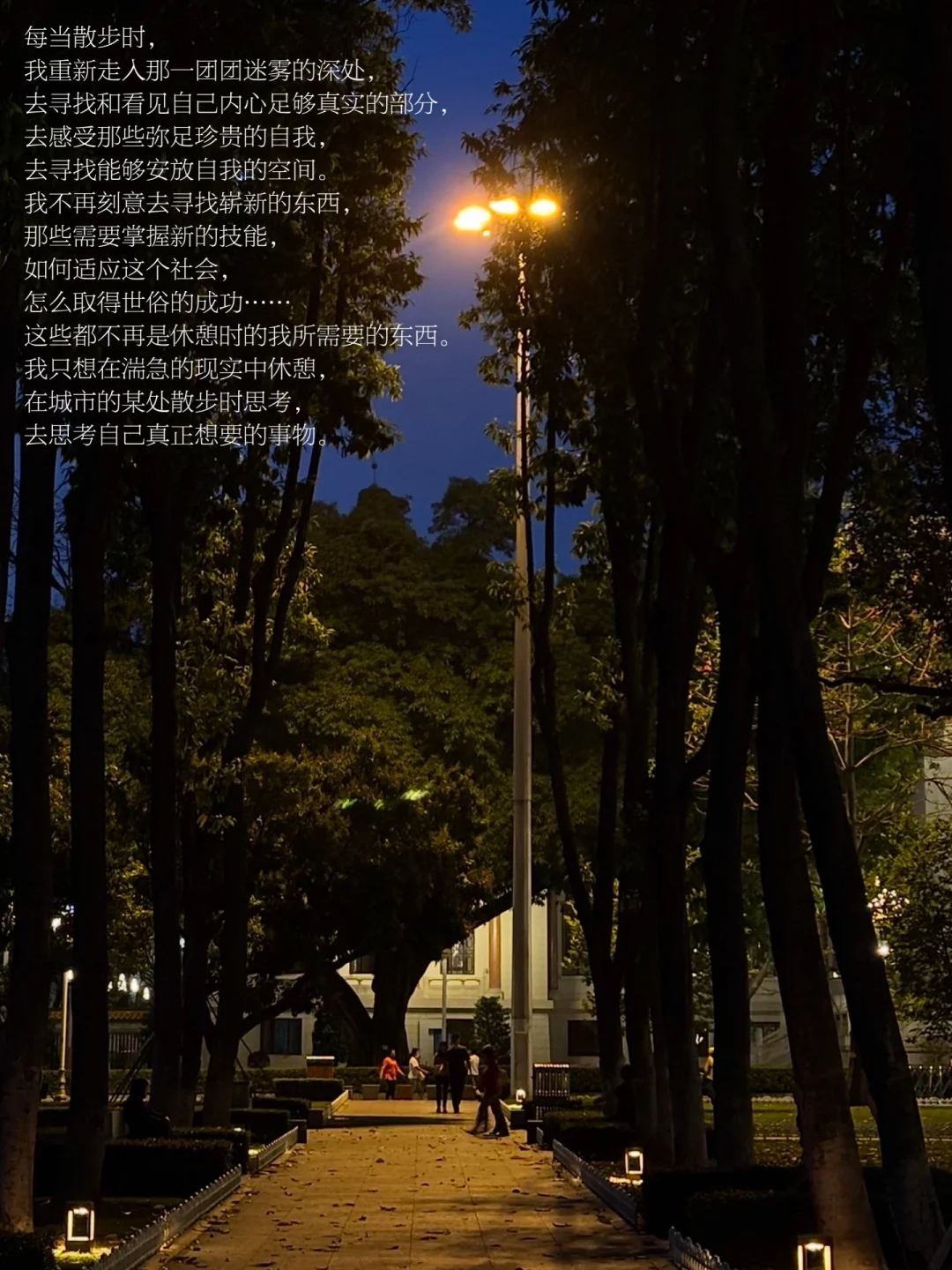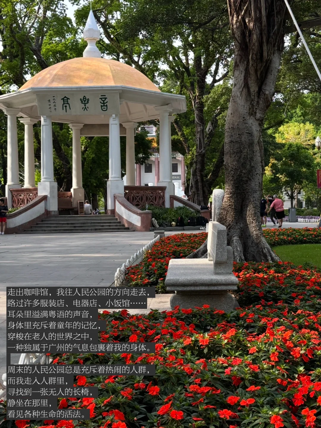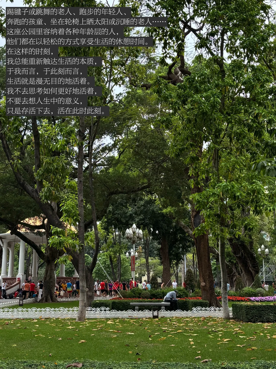 走出咖啡馆,我往人民公园的方向走去,周末的人民公园总是充斥着热闹的人群,而我走入人群里,寻找到一张无人的长椅,静坐在那里,看见各种生命的活法。这座公园里容纳着各种年龄层的人,他们都在以轻松的方式享受生活的休憩时间。在这样的时刻,我总能重新触达生活的本质,于此刻而言,生活就是漫无目的地活着。我不去思考如何更好地活着,不要去想人生中的意义,只是存活下去,活在此时此刻。